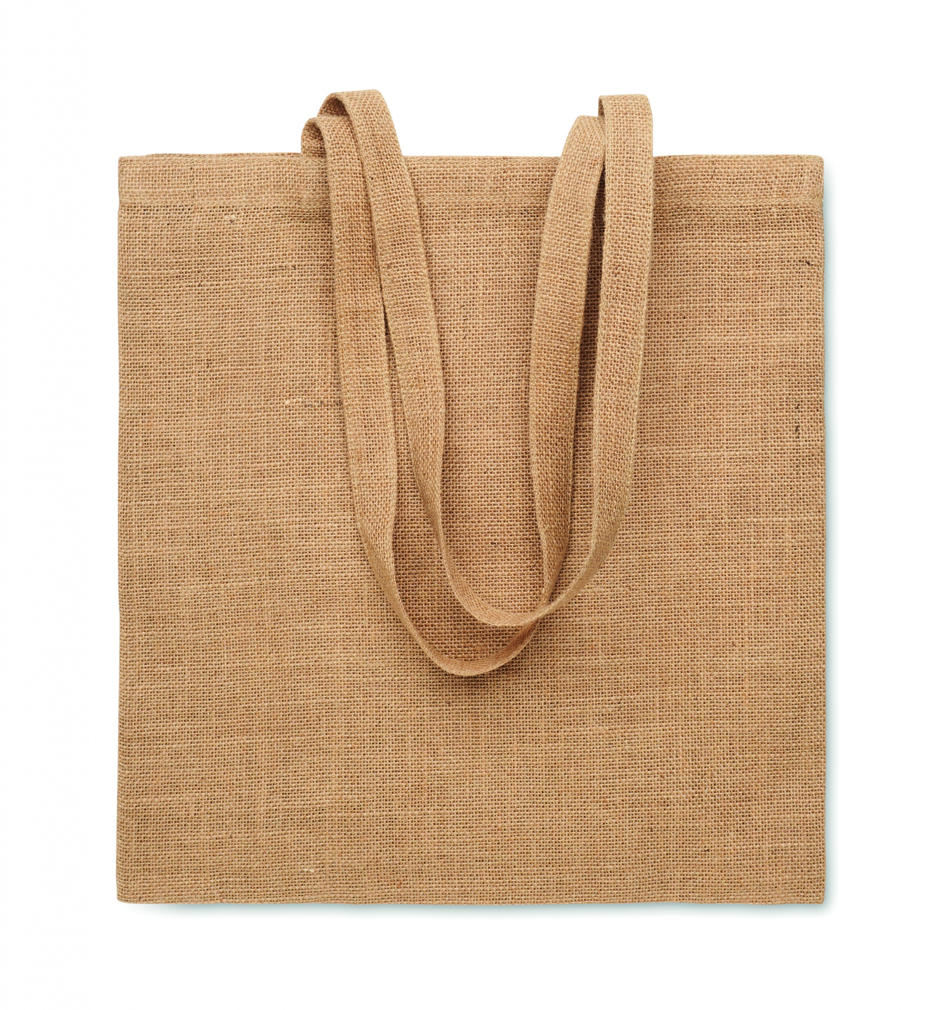 Einkaufstasche aus Jute mit langen Tragegriffen.