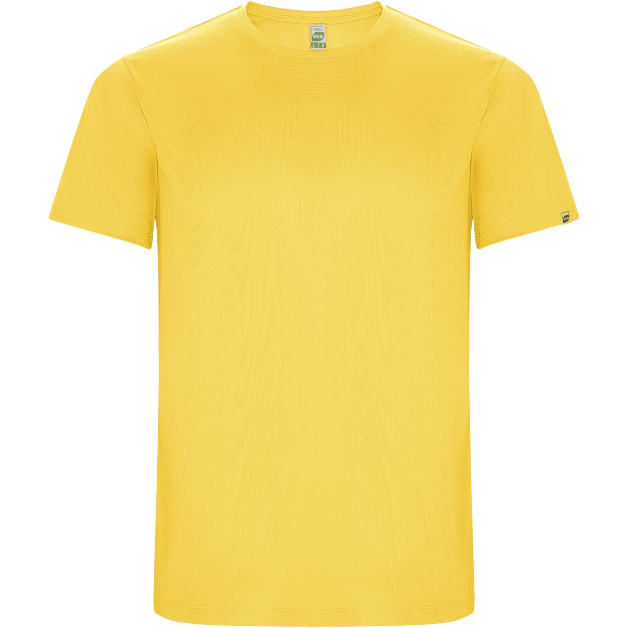 Funktions-T-Shirt aus recyceltem Polyester CONTROL DRY. Rundhalsausschnitt mit farblich abgesetzten Nähten. ECO-Logo-Etikett am Ärmel. Verpackung aus Recyclingmaterial. Herausnehmbares ECO-Etikett. Verpackung aus Recyclingmaterial. Technisches Gewebe. Das Modell ist 180 cm groß und trägt Größe M.