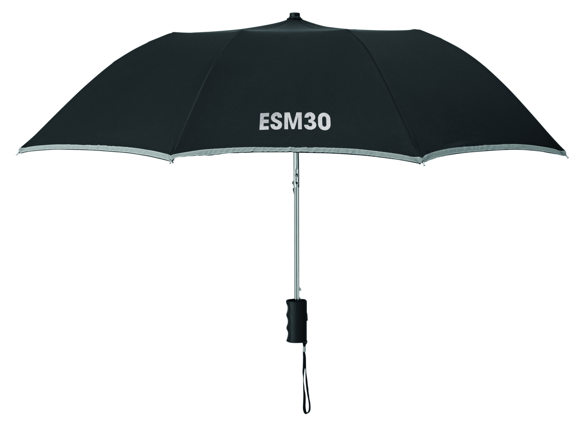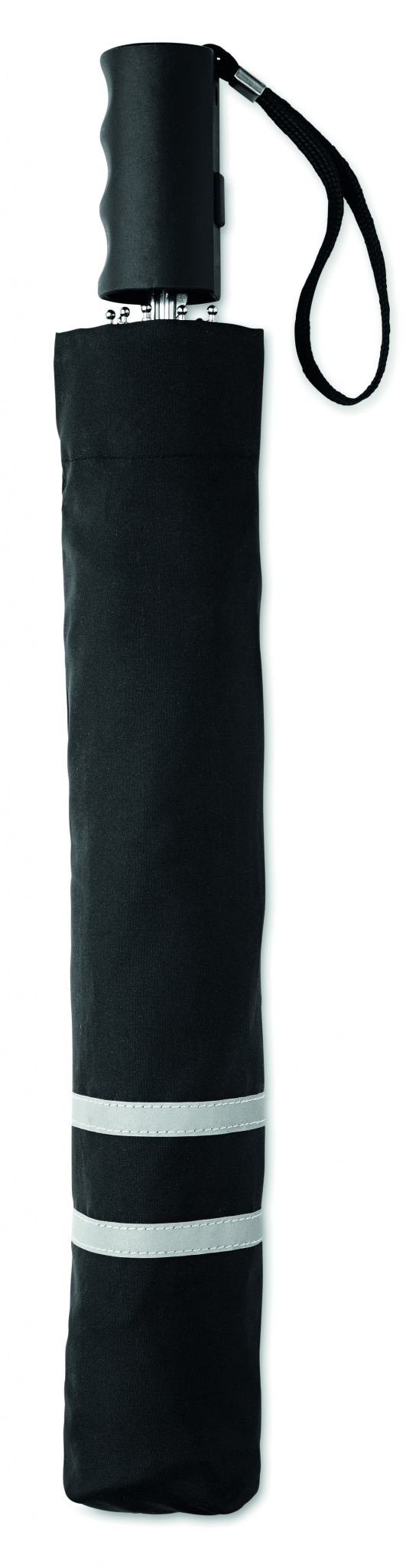 21'' Regenschirm aus 190T Seide. 2-fach faltbar. Gestell aus verzinktem Stahl, Schienen und Spitzen. Segmente mit reflektierendem Rand. Schwarzer Griff aus Kunststoff mit Handschlaufe. Passende Schirmhülle. Automatische Öffnung, manuelle Schließung.