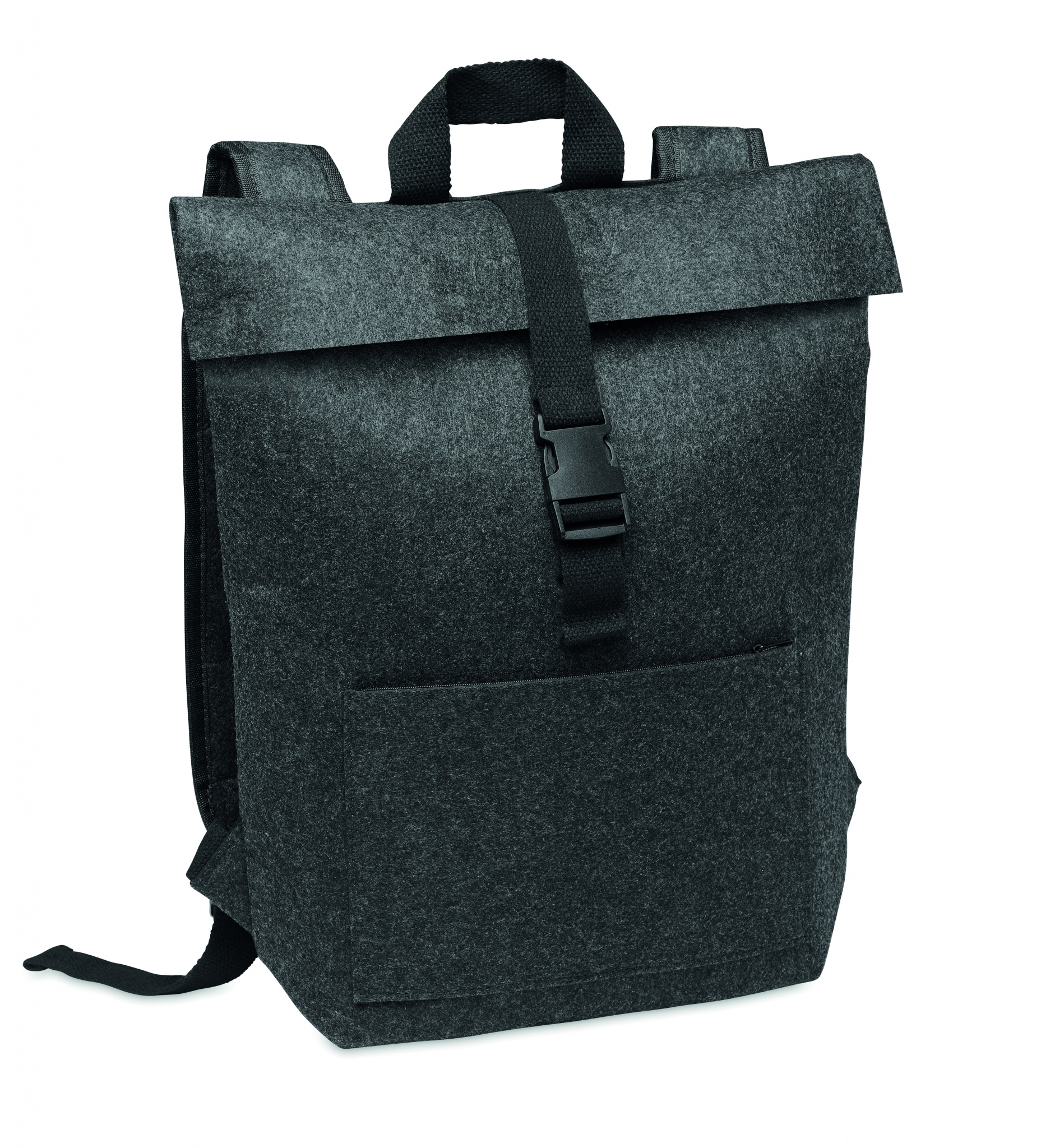 Rucksack aus RPET-Filz mit Laptop-Fach. Reißverschlusstasche auf der Vorderseite, Verschlussgurt aus Baumwolle.