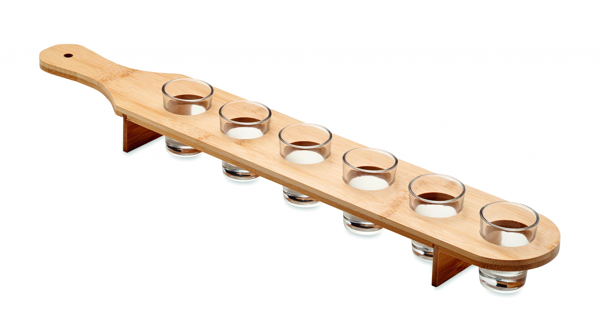 Set mit 6 Schnapsgläsern auf einem Tablett in Optik eines Paddels. Füllmenge: 20 ml. Bambus ist ein natürliches Produkt, es kann daher zu leichten Abweichungen in Farbe, Dekor und Maßen kommen.