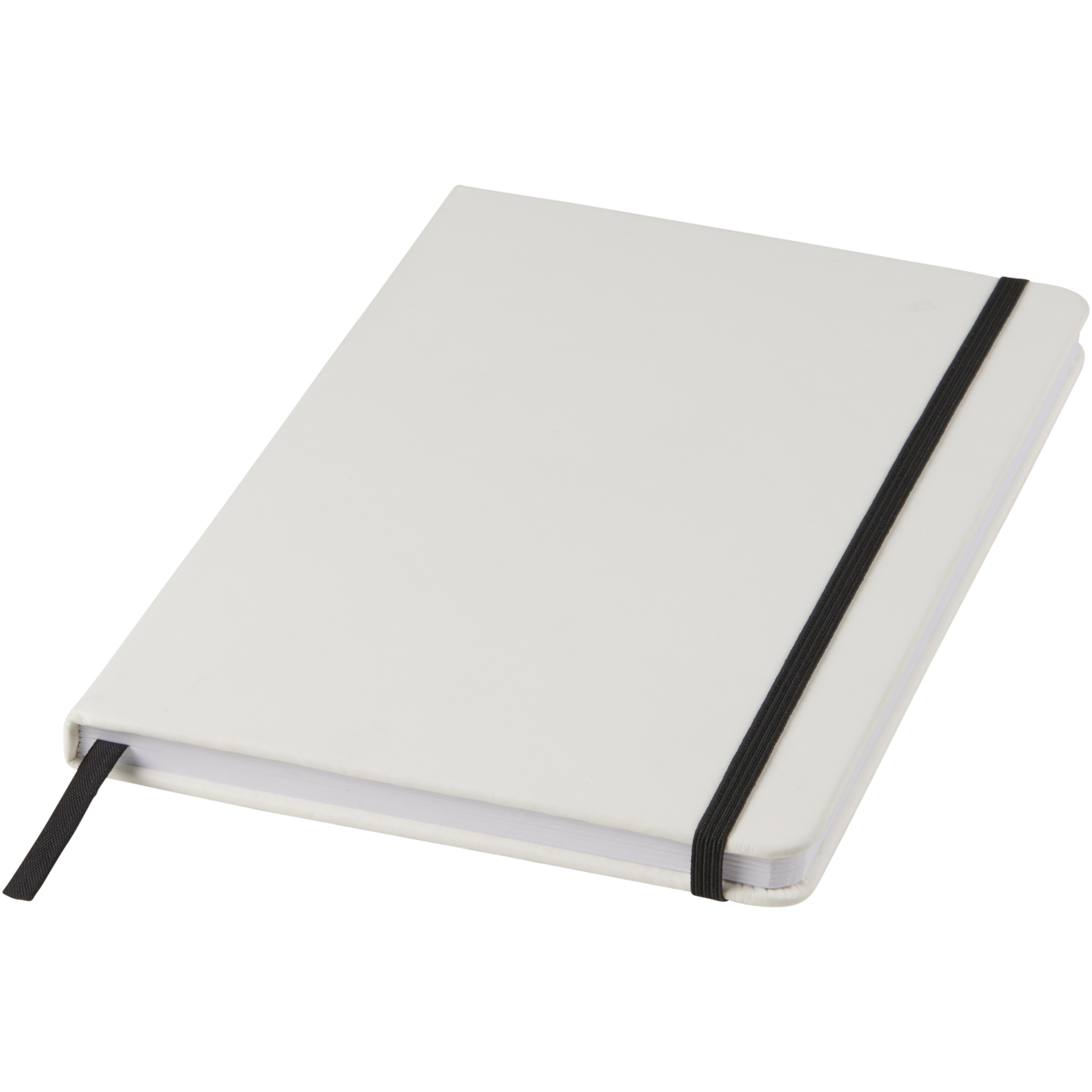 Weißes A5 Notizbuch mit farbigem Gummizug und Lesebändchen. Enthält 80 Blatt (60 g/m²) liniertes Papier.