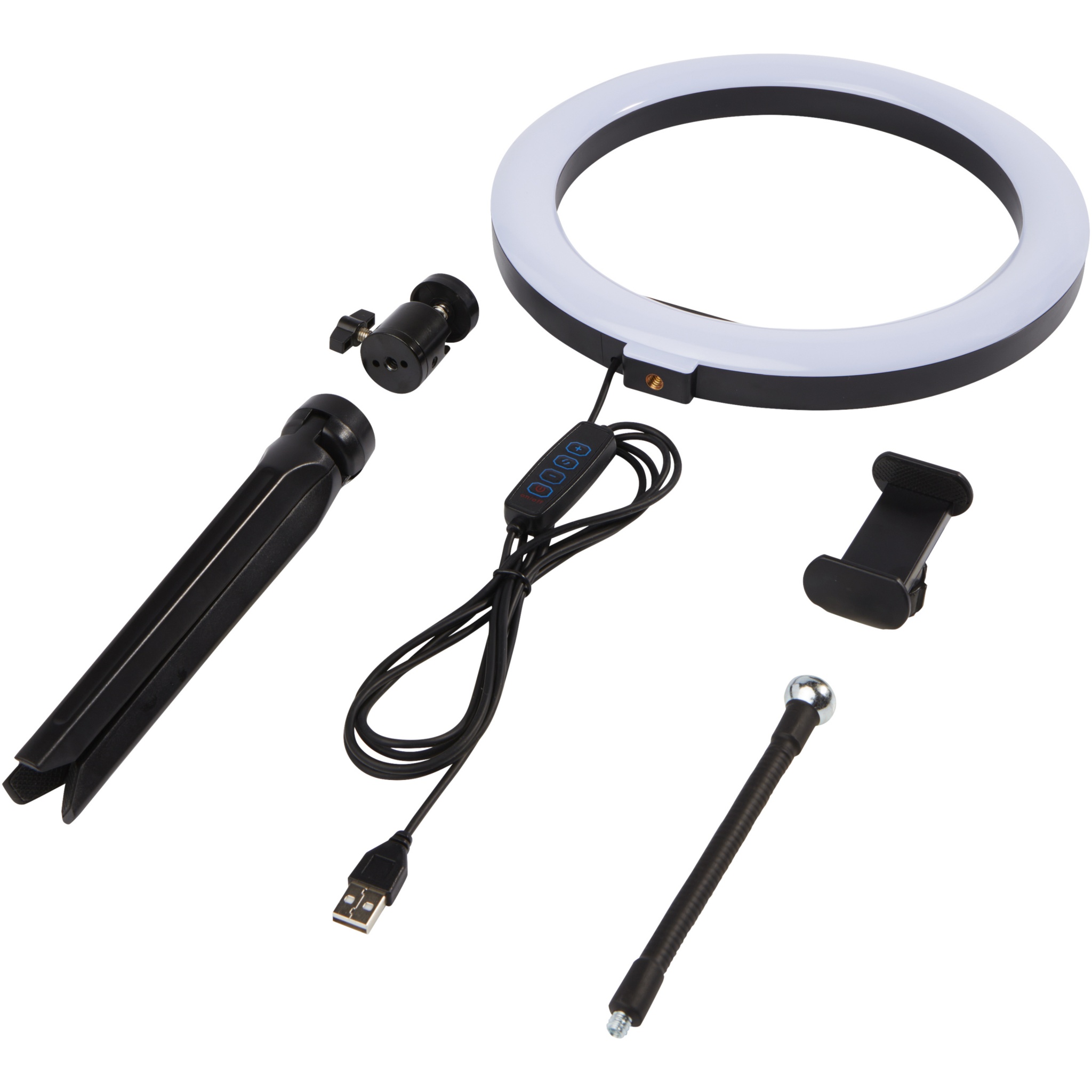 LED-Ringlicht (23 cm) mit Stativständer und Telefonhalterung. Das ideale Gadget für jeden Fotografen/YouTuber/Vlogger/Content-Macher, der regelmäßig Streams oder Sendungen herstellt. Das Ringlicht leuchtet Ihr Gesicht gleichmäßig aus, ohne harte Schatten zu werfen. Die Lampe verfügt über 120 warmweiße LEDs, die in 10 verschiedenen Helligkeitsstufen eingestellt werden können, um das perfekte Licht zu erhalten. Lieferung in einer Avenue Geschenkbox.
