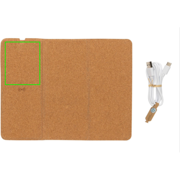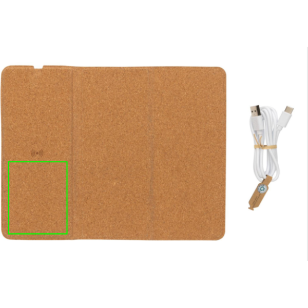 Wireless 10W charging mousepad with complete FSC 100% cork exterior. Can be used both as a mousepad and as a phone stand. Wireless charging compatible with all QI enabled devices like Android latest generation, iPhone 8 and up. Including 120 cm type C charging cable made from RCS certified recycled TPE. Packed in FSC® mix kraft box. Type-C in; 9V/2A; Wireless output 9V/1.1A (10W)