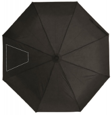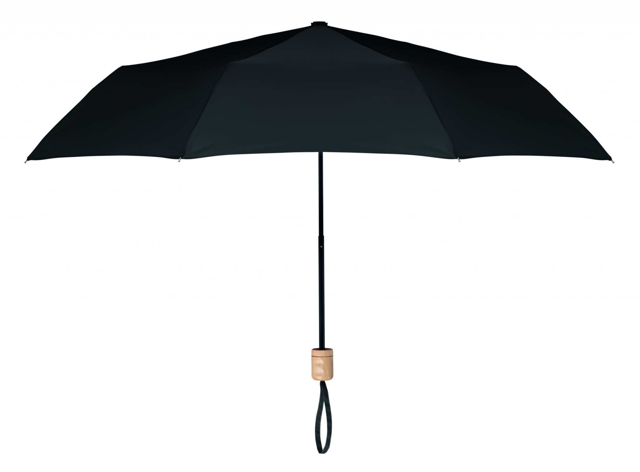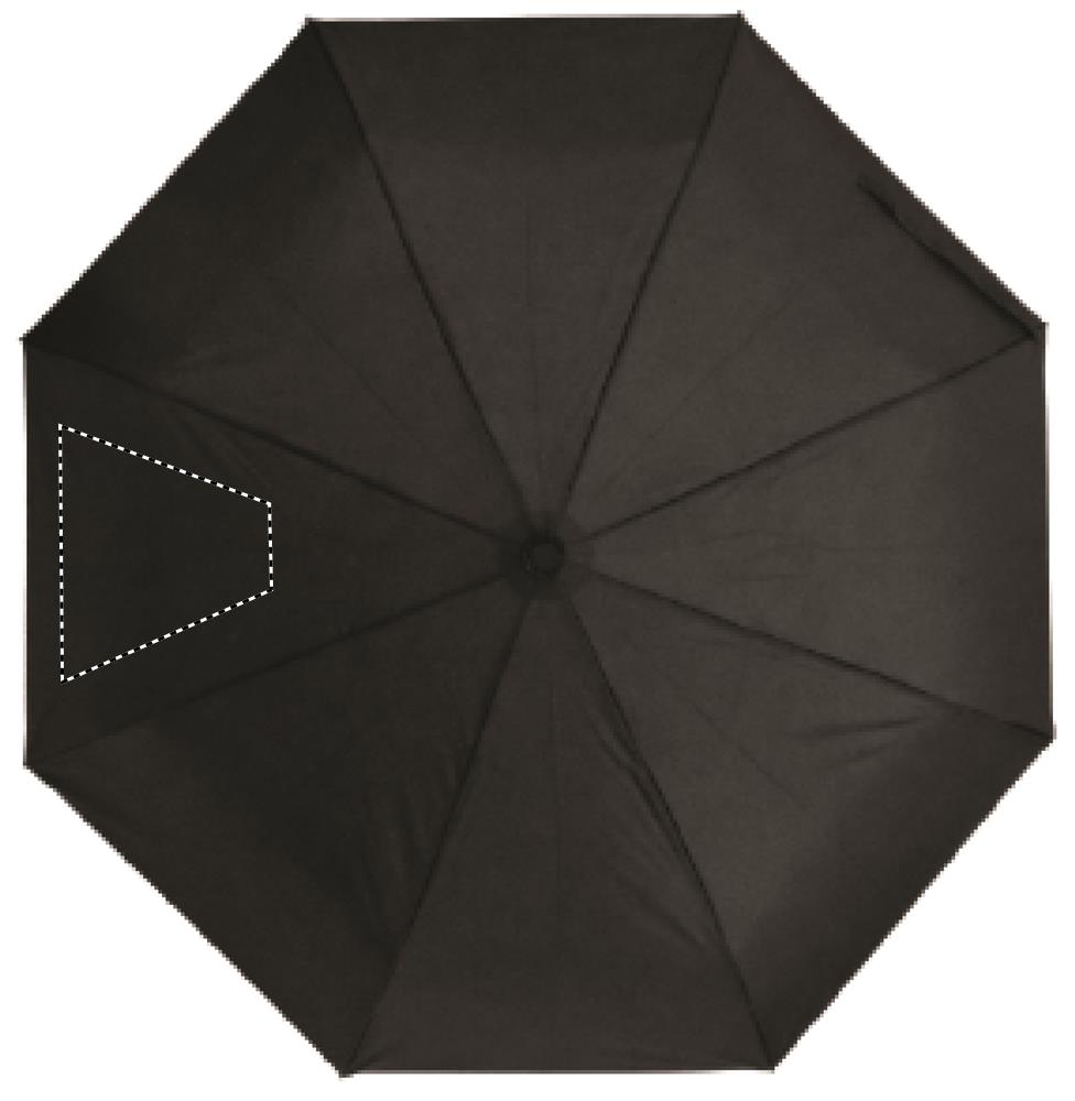 Foldable 21 inch umbrella, 3 sections with 190T RPET pongee fabric, black plated frame and ribs with wooden handle. Manual open and closure. Self material pouch.