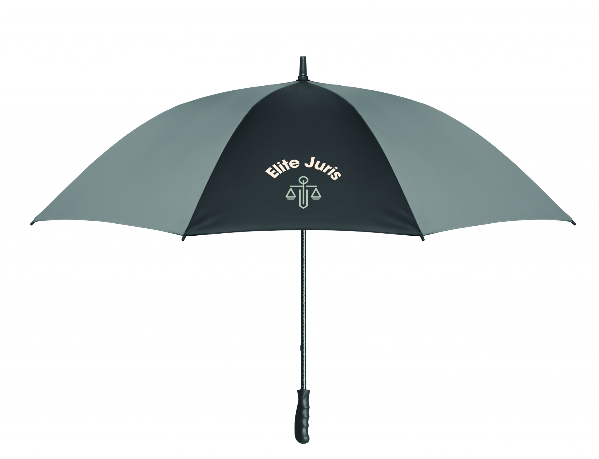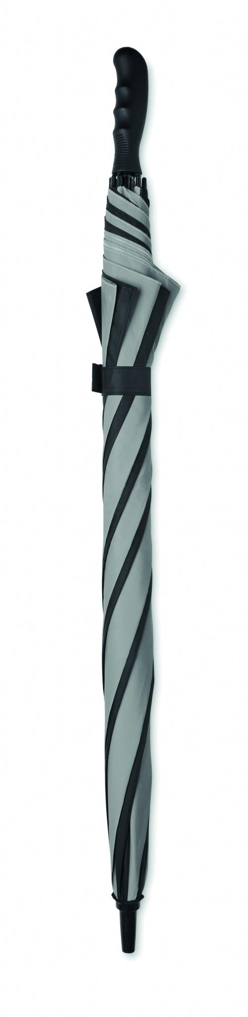 30 inch manual open windproof umbrella in 190T pongee (4 panels) and reflective material (4 panels) with fiberglass frame, ribs and shaft. Straight ABS handle with rubber finish. Manual closure.