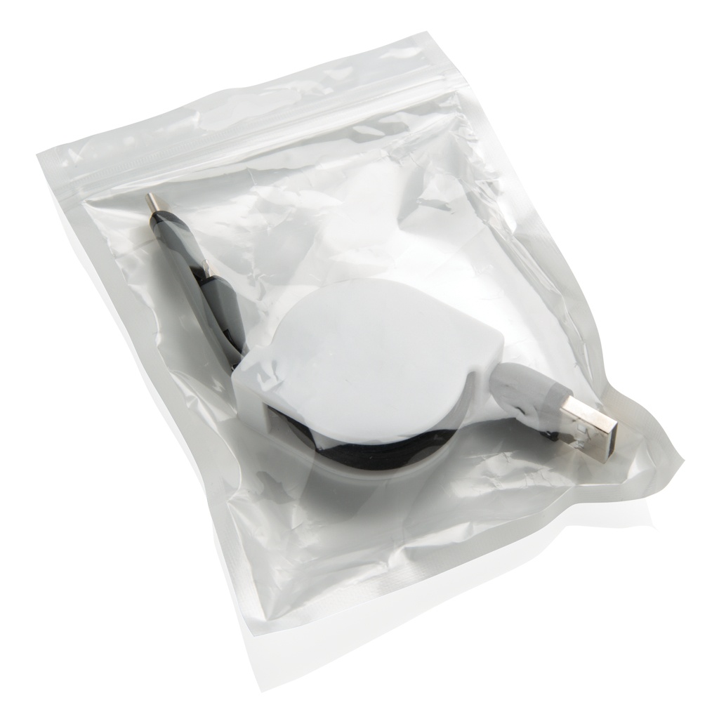 Compact and retractable 3 in 1 charging cable with type C and double-sided connector for IOS and Android devices that require micro usb. Because of the retractable mechanism the 100 cm long flat cable can easily be taken anywhere without it getting tangled. ABS case with TPU material cable. Also suitable for syncing.