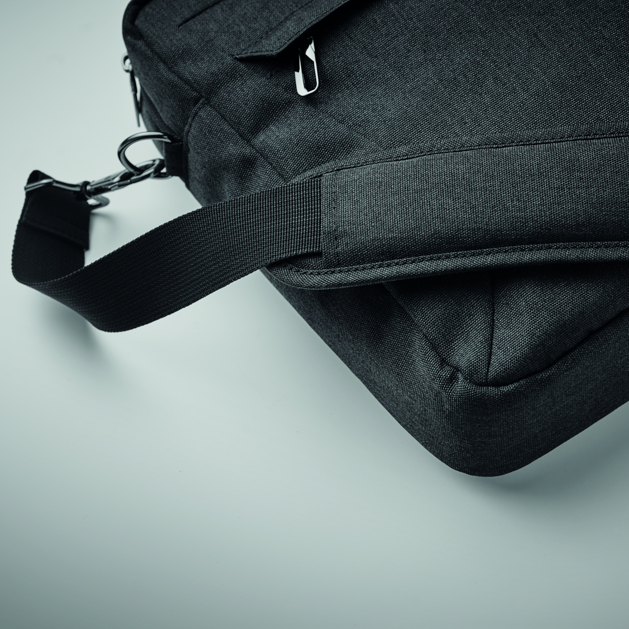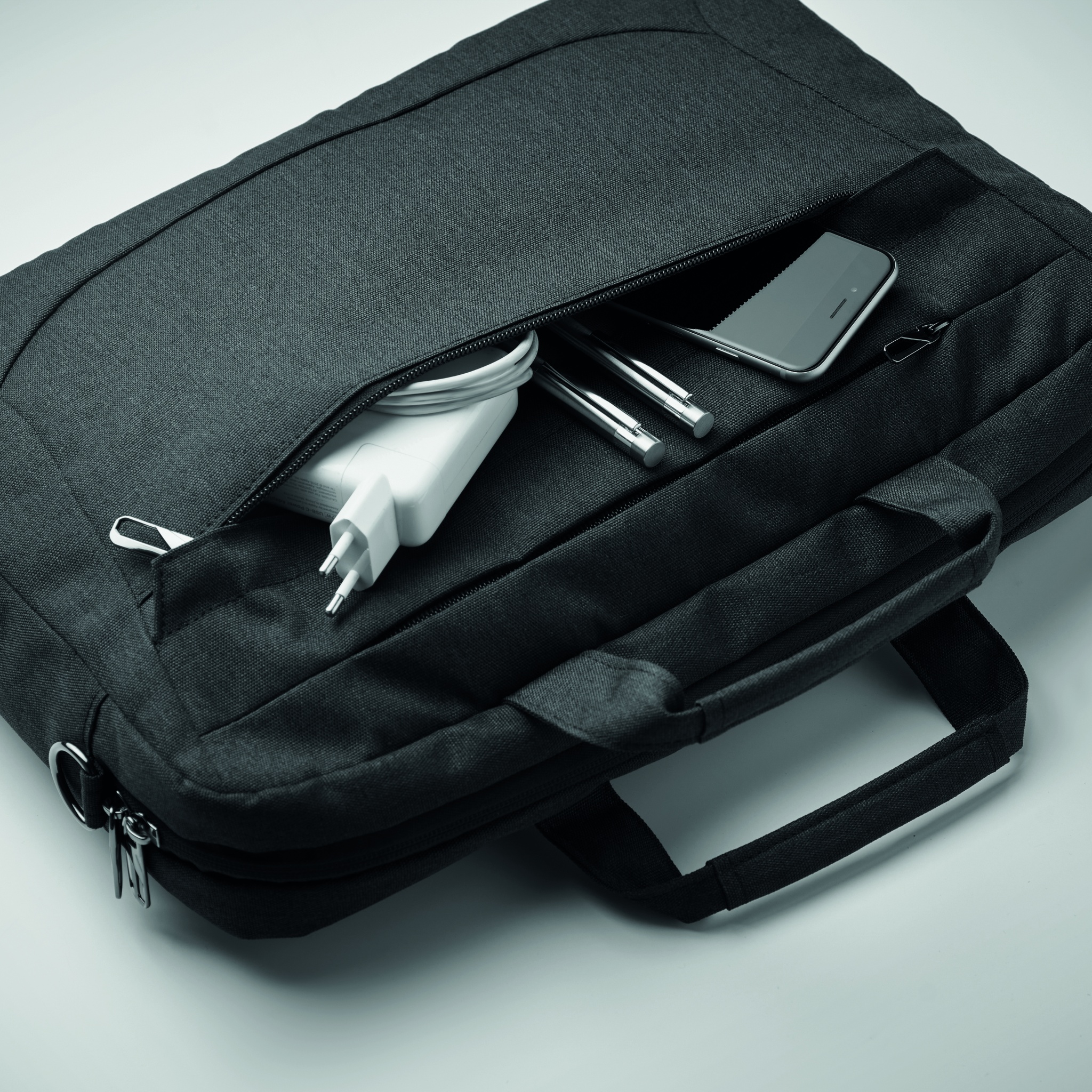 15 inch laptop bag in 600D RPET polyester. 2 main internal compartments for both laptop as tablet and large zippered front pocket. It has a small zippered pocket. Detachable and adjustable shoulder straps. Trolley holder on reverse side.