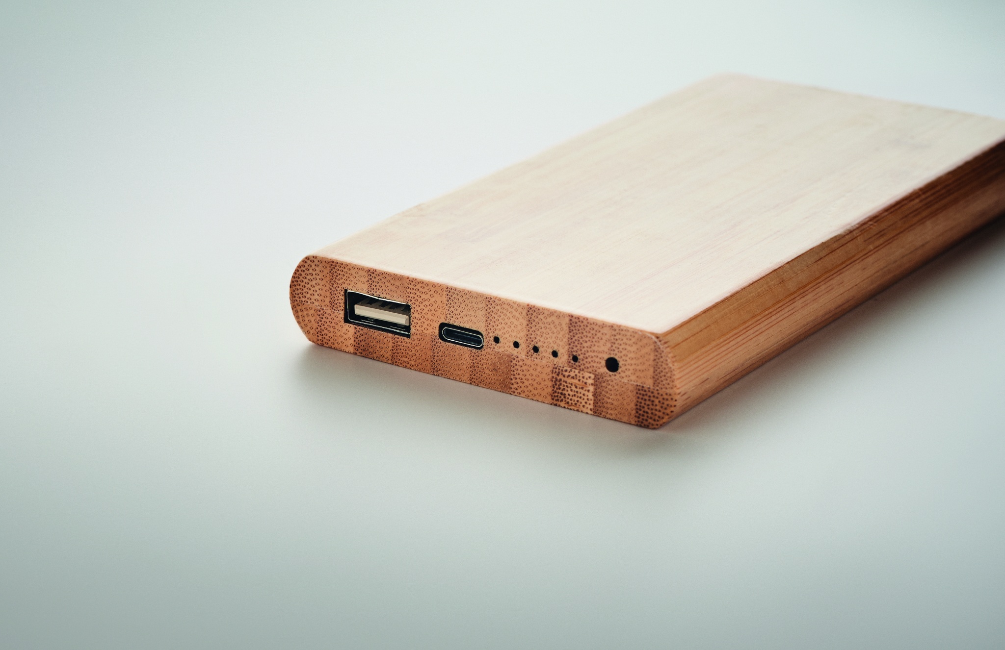Wireless charging and power bank 6000 mAh capacity in Bamboo casing. Output current DC5V/2A. Includes indicating light and USB cable with Type C plug. In/Output: Type-C. Bamboo is a natural product, there may be slight variations in colour and size per item, which can affect the final decoration outcome.