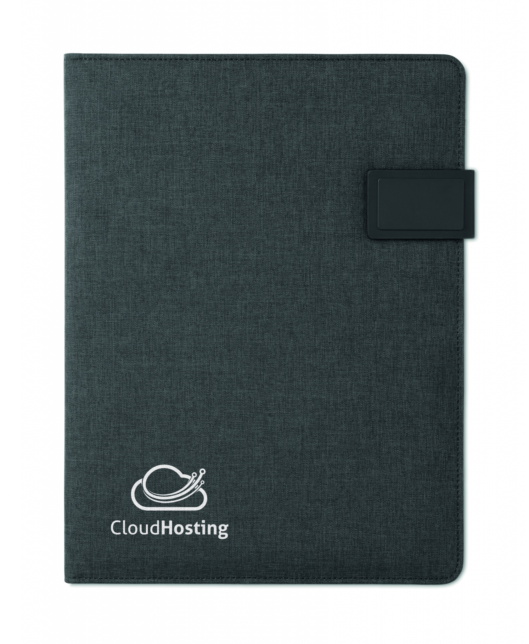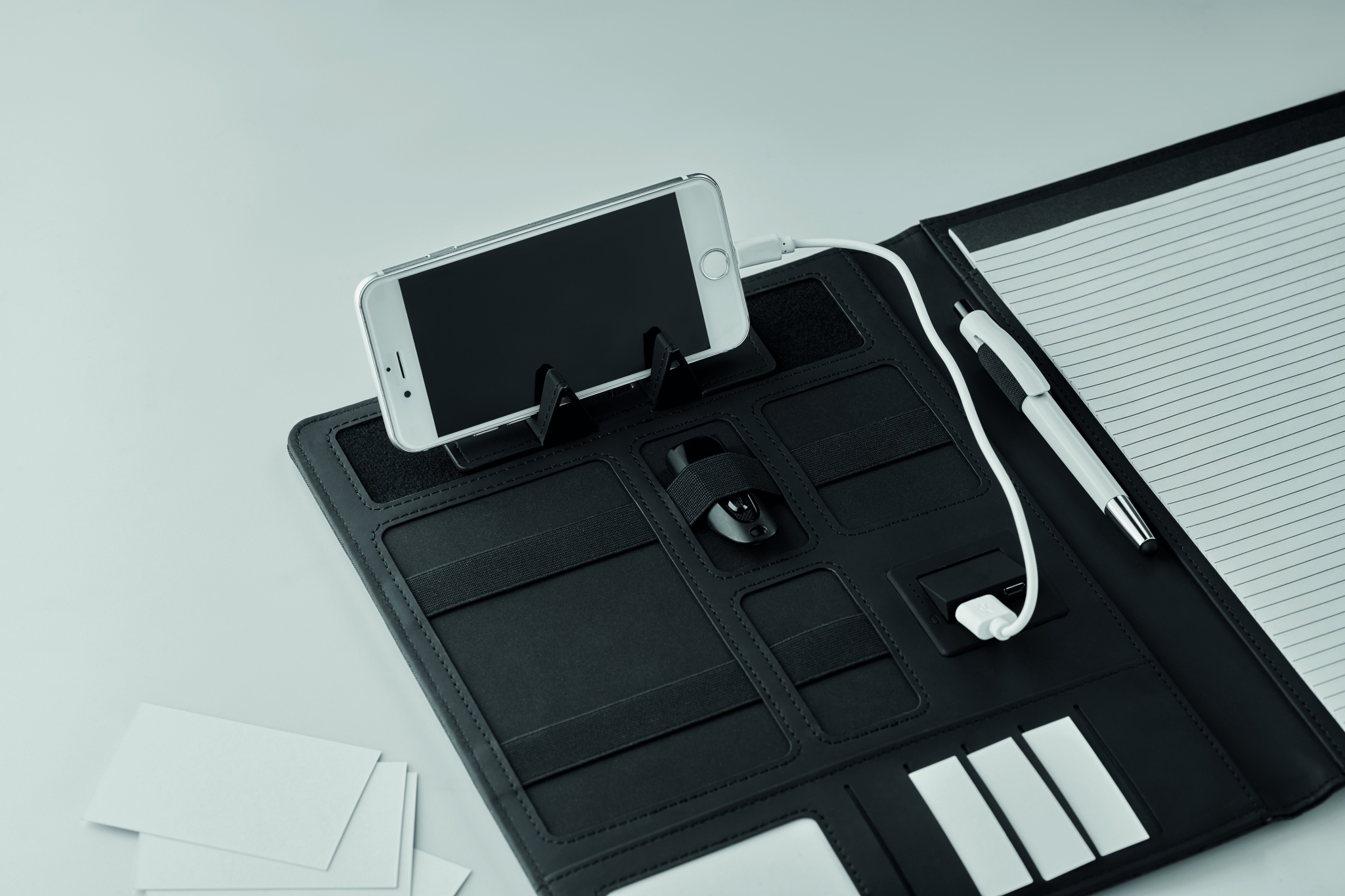 A4 conference folder with linen-PU cover. 4000 mAh power bank. Built-in micro USB to a Type C connector. 20 lined sheets notepad. Multiple internal compartments. Magnetic closure. Elastic pen holder.