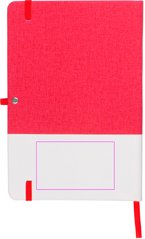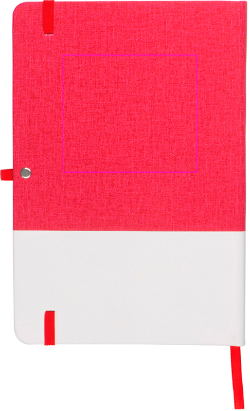 A5 notebook with 160 squared pages, PU fabric cover, bookmark, ballpen loop, and elastic rubber closure band. We print your logo on the white surface.