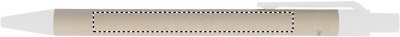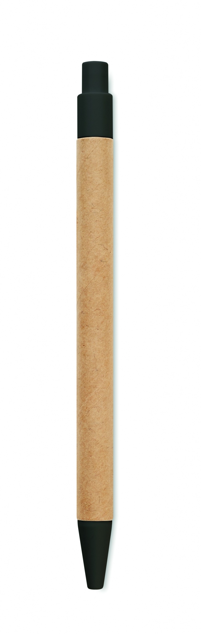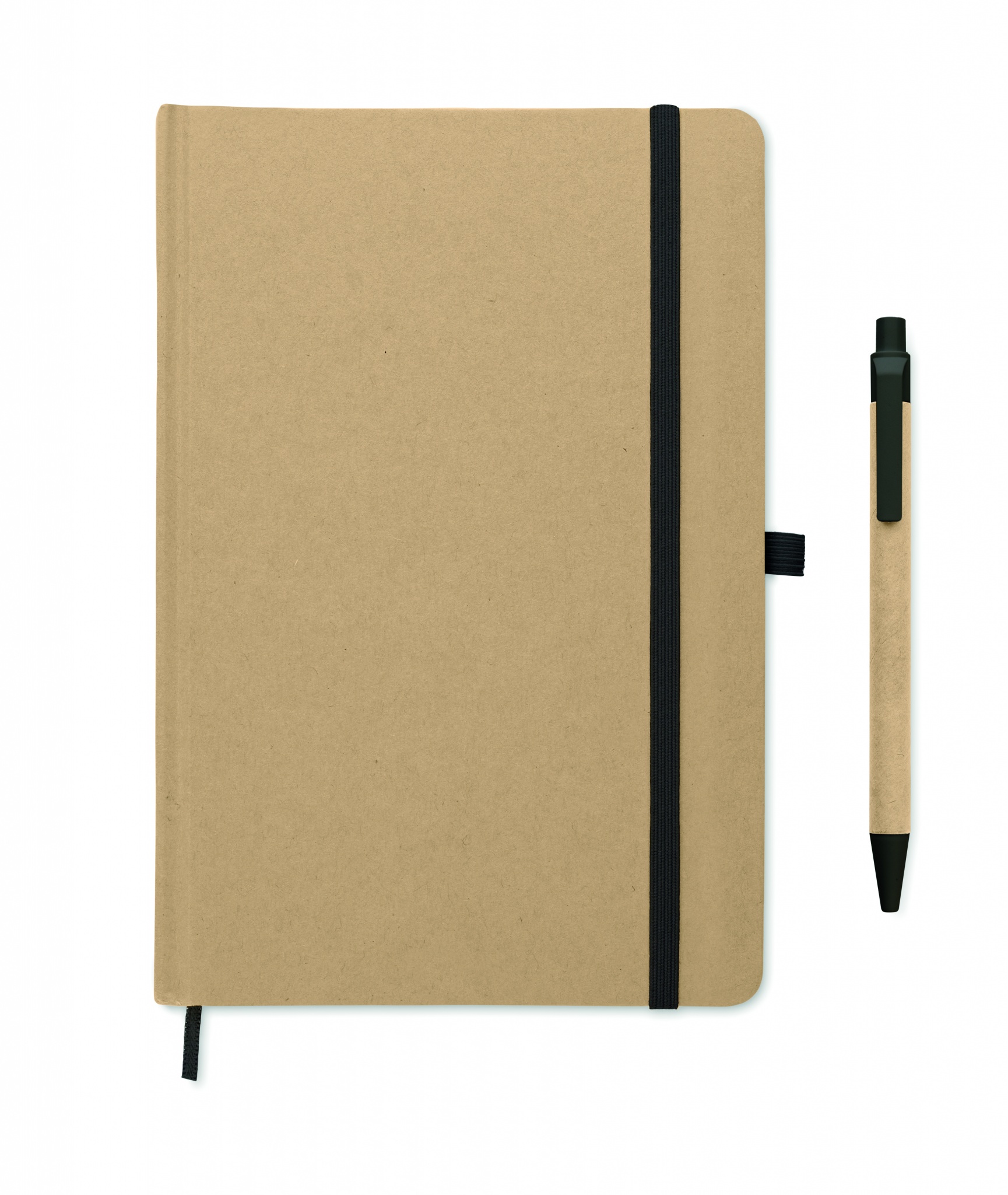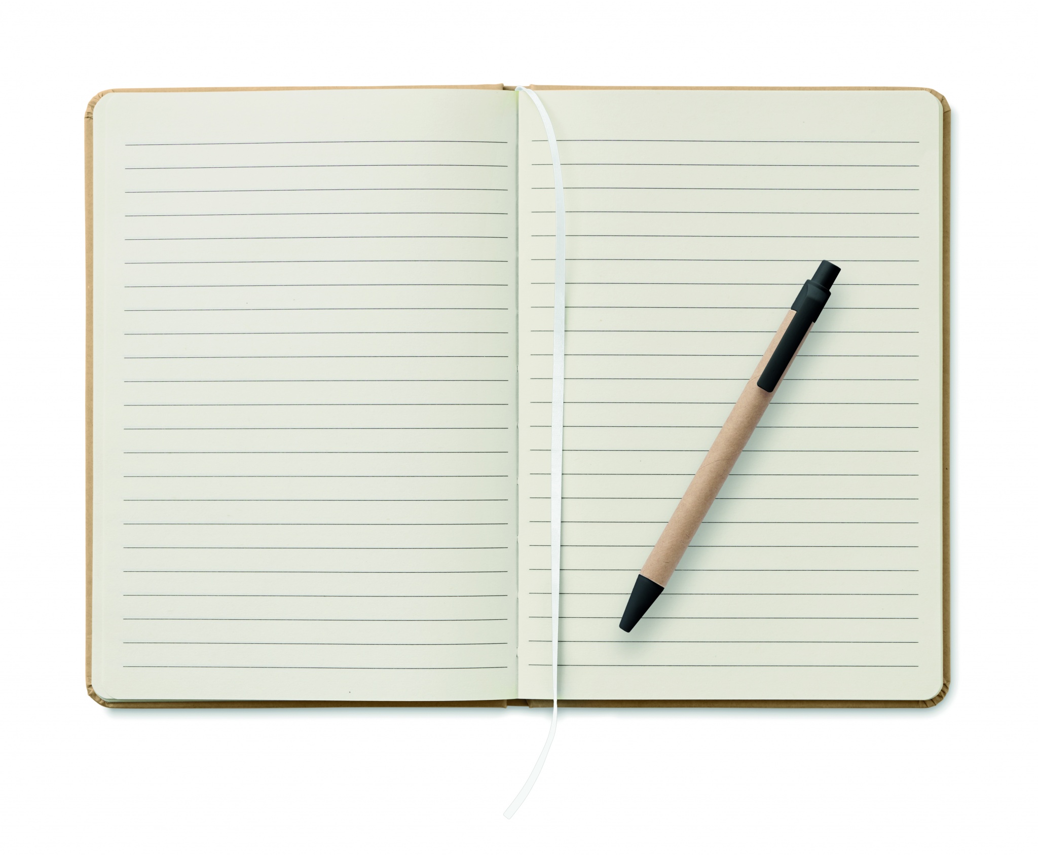 A5 notebook with hard recycled carton cover. Case bound. 160 lined pages (80 sheets recycled paper). Elastic closure strap and pen loop, ribbon bookmark. Includes push button ball pen with recycled paper barrel. Blue ink.