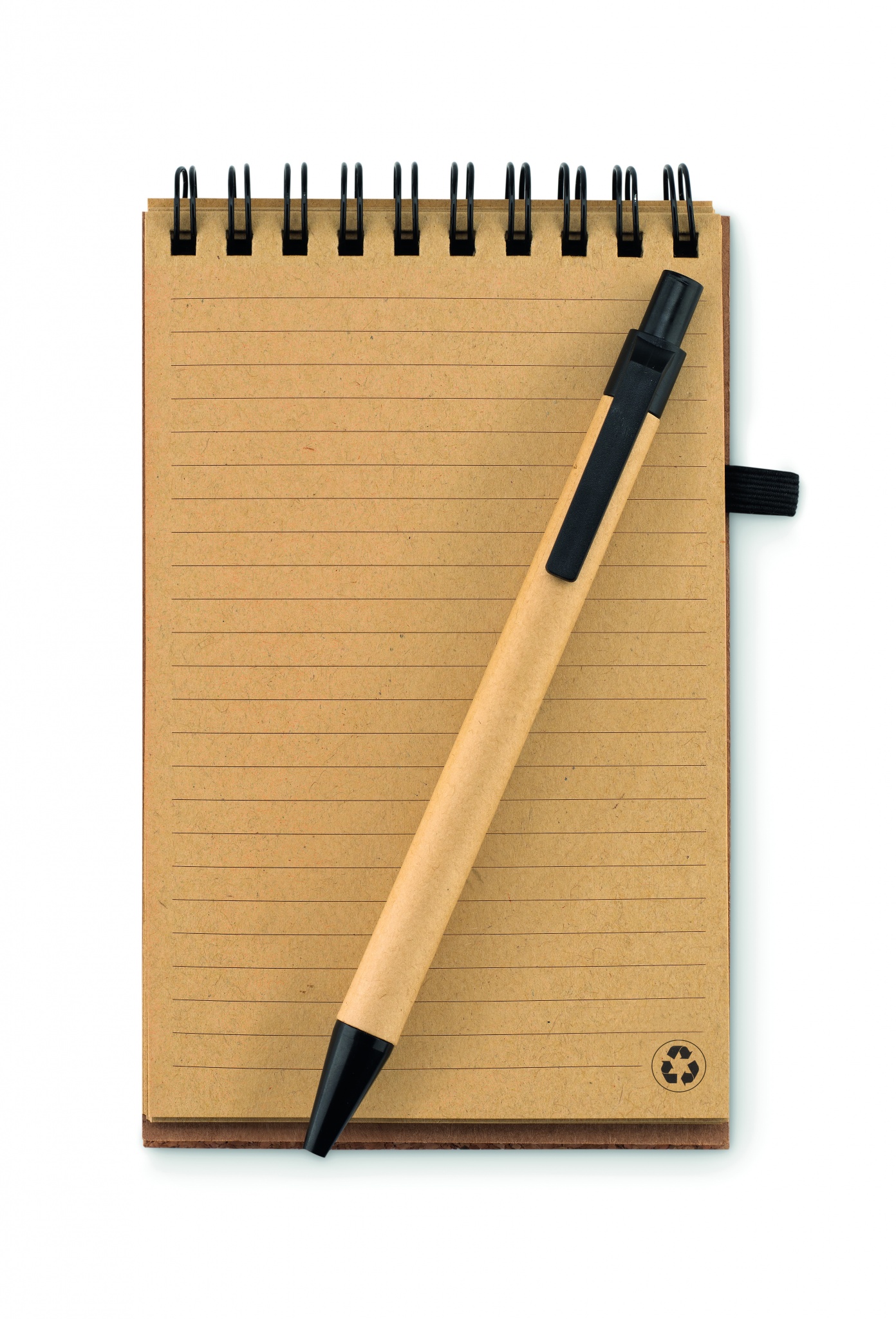 A6 notepad with cork cover. Twin-wire. 70 lined recyced paper sheets. Matching push button ball pen with recycled carton barrel and corn PLA details. Black ink. Elastic closure strap and pen holder. Cork is 100% natural material. Due to its structural nature and surface porosity the final print result per item may have deviations.