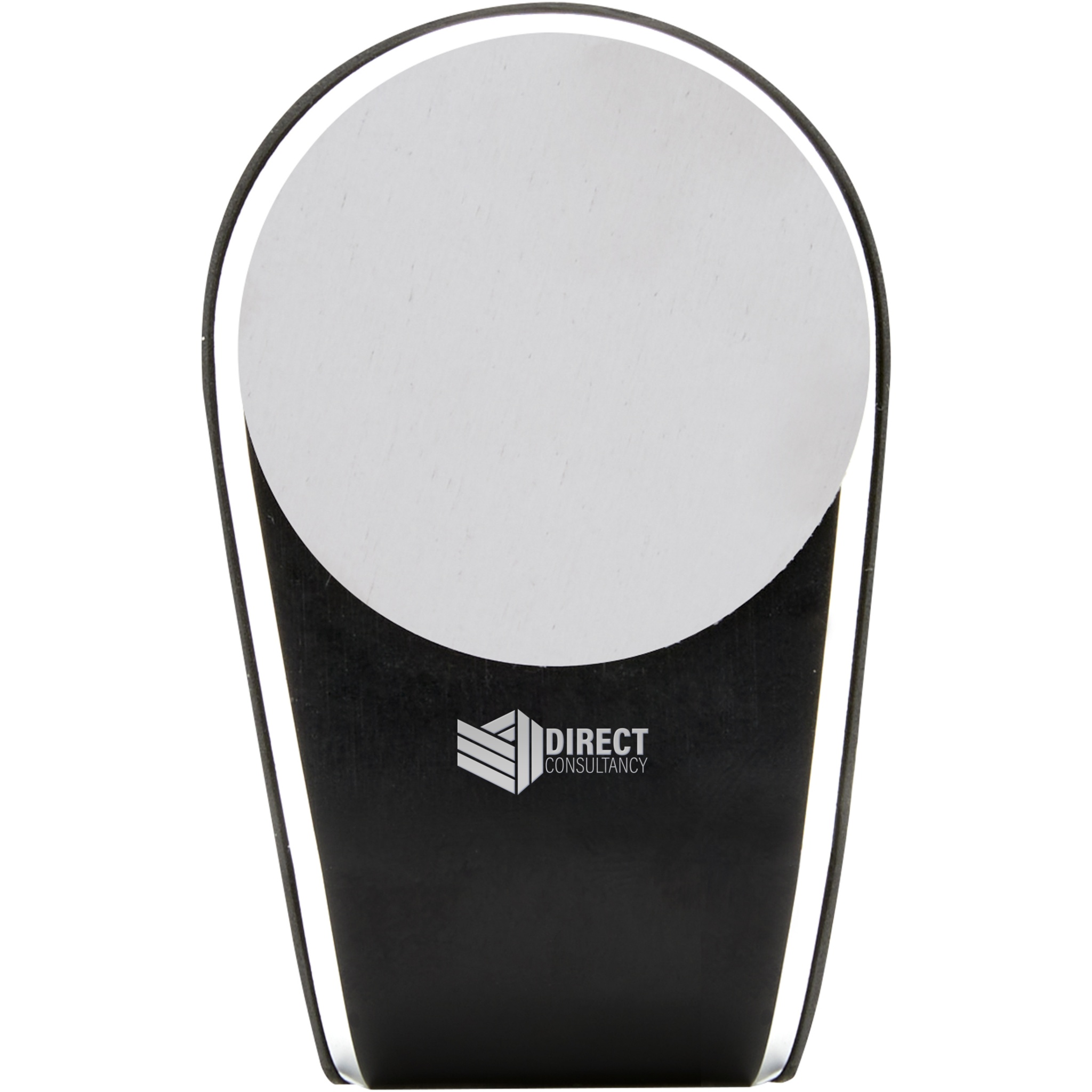 Aluminum magnetic phone holder for the car. The clip can easily be plugged into the car air vent, and the metal plate can be attached to the back of the phone or phone cover. The holder might not be compatible with all types of phone covers/cases.