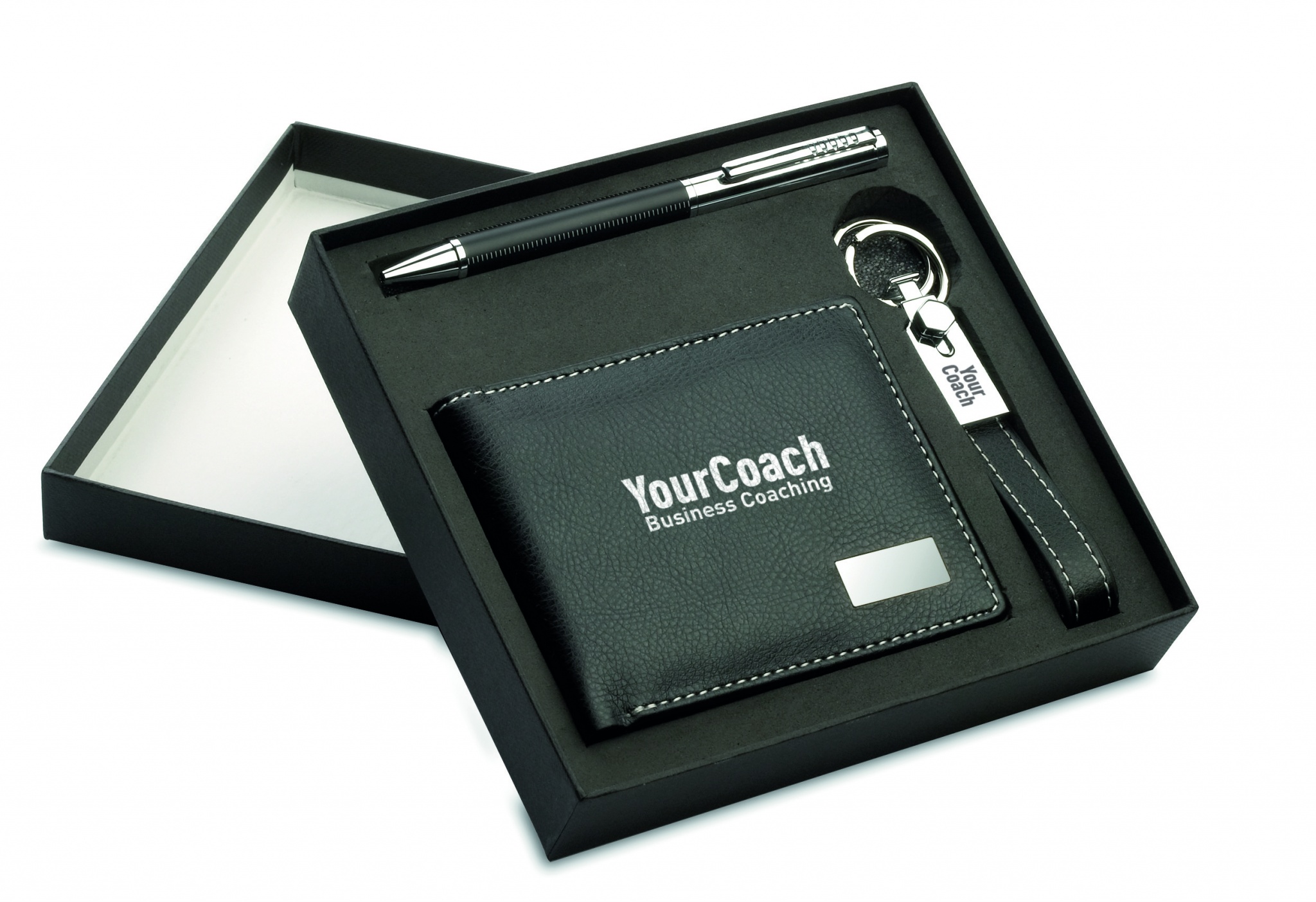 Elegant gift set presented on an EVA tray and carton box. Includes a twist ball pen with blue ink refill, a metal key ring with PU loop and a PU wallet. All PU finish with contrasted stitching.