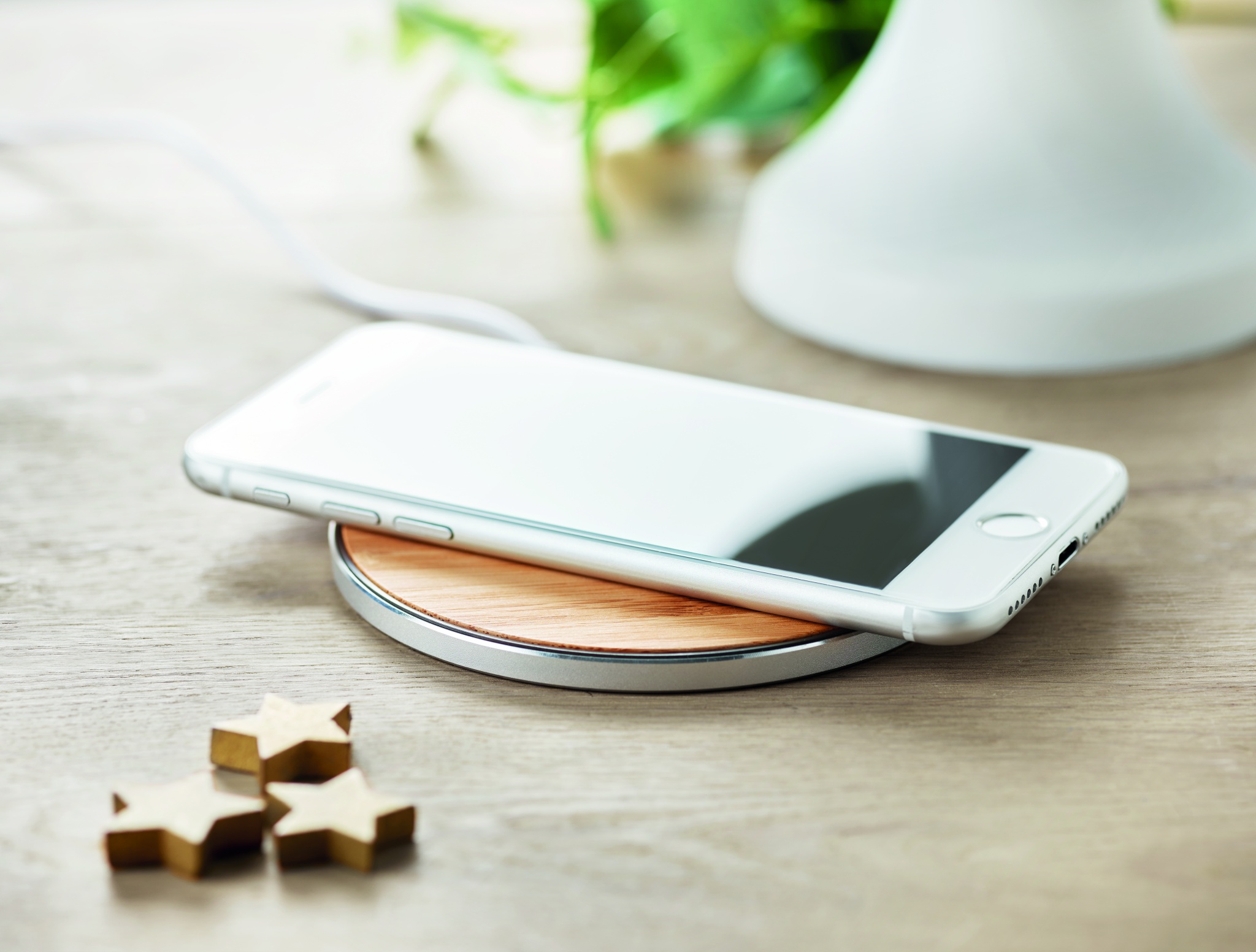 Wireless quick charger in bamboo and aluminium. Blue light lit when charging. Output: DC9V/1.1A (10W). Compatible with all QI enabled devices such as latest Androids, iPhone® 8, X and newer. Bamboo is a natural product, there may be slight variations in colour and size per item, which can affect the final decoration outcome.