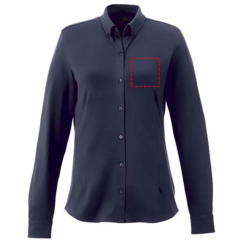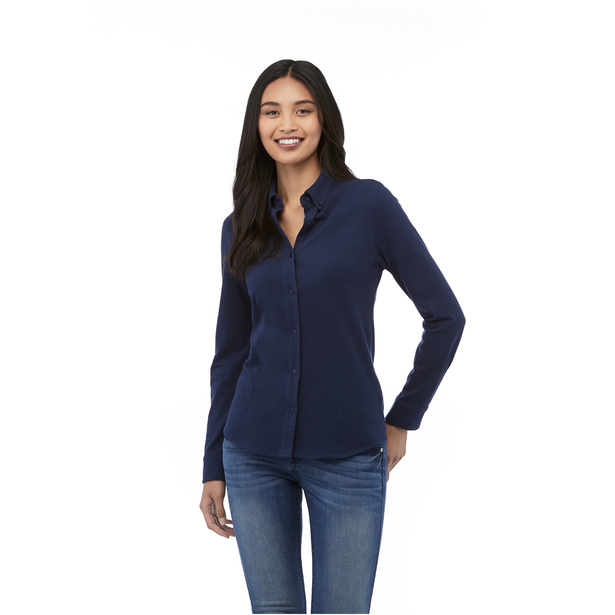 Self fabric collar. Stretch fabric. Adjustable cuff with single pleat. Button-down collar. Shaped seams and tapered waist for flattering fit. Satin piping at inside neck. Dyed-to-match engraved buttons. Woven main label.