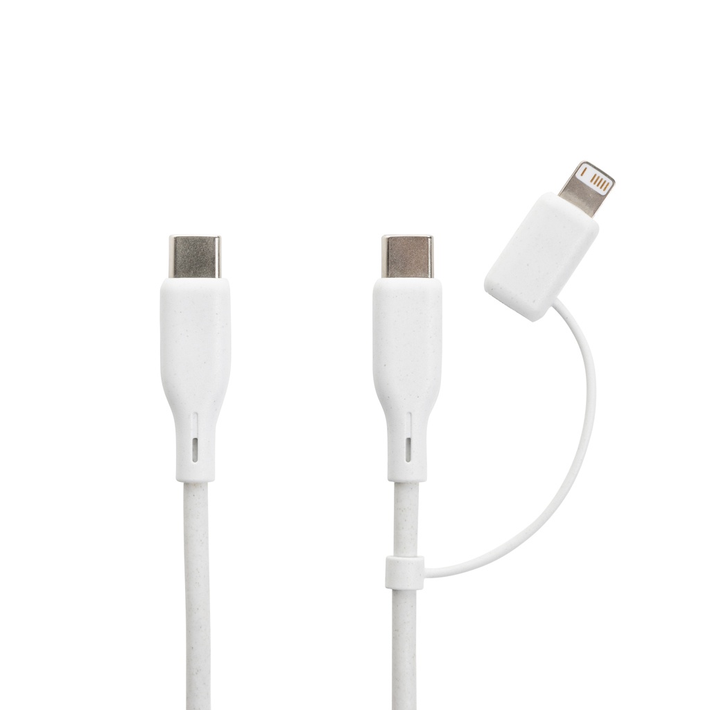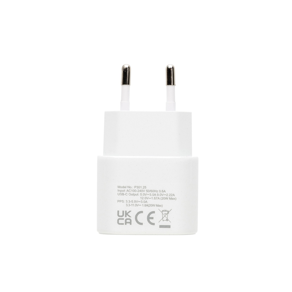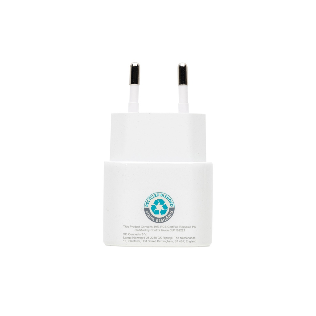 2 pcs 20W fast charging set for mobile devices and other small devices. With EU adapter with 20W USB C port and 120 cm recycled TPE 60W fast charging cable (USB C to USB /Lightning). The cable supports data transfer and also charging of larger devices like laptops. Adapter and cable made from RCS certified recycled PC, ABS and recycled TPE. Packed in pouch made from RCS certified recycled PET. Total recycled content of whole set: 59% based on total item weight. RCS certification ensures a completely certified supply chain of the recycled materials. Packed in FSC® packaging. PVC Free. Input wall charger AC 100-240V 50/60Hz 0.6A; Output wall charger USB-C :5.0V⎓3.0A,9.0V⎓2.22,12.0V⎓1.67A (20W Max);