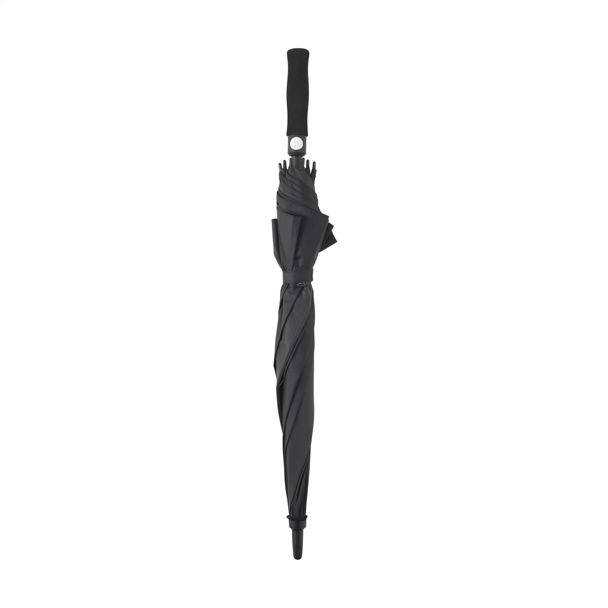 WoW! Umbrella with 190T RPETpongee polyester canopy. This umbrella has two discreet, reflective sections which blend into the umbrella’s design in daylight. These reflective sections light up when they catch the light to make the user visible in dark conditions. Features automatic telescopic suspension (auto-open), fibreglass frame, a metal shaft, EVA soft handle and Velcro closure. RCS-certified. Total recycled material: 17%.