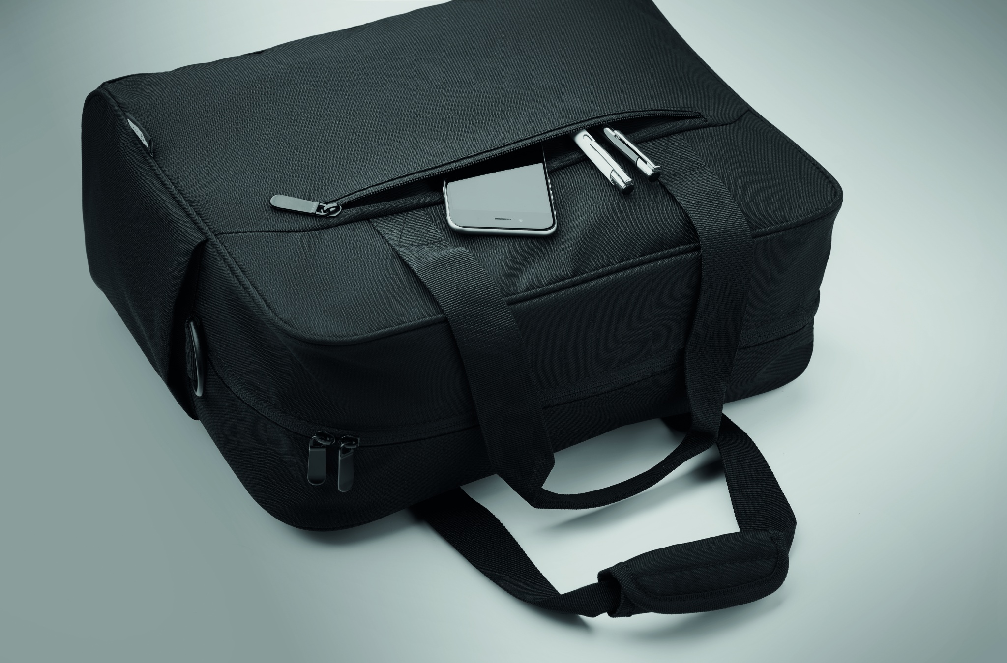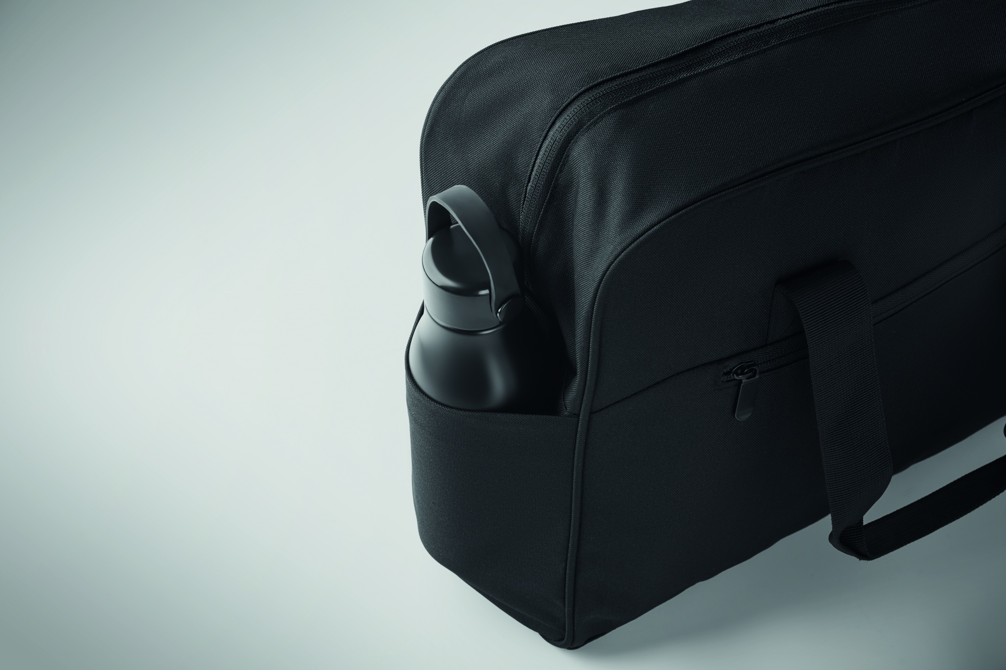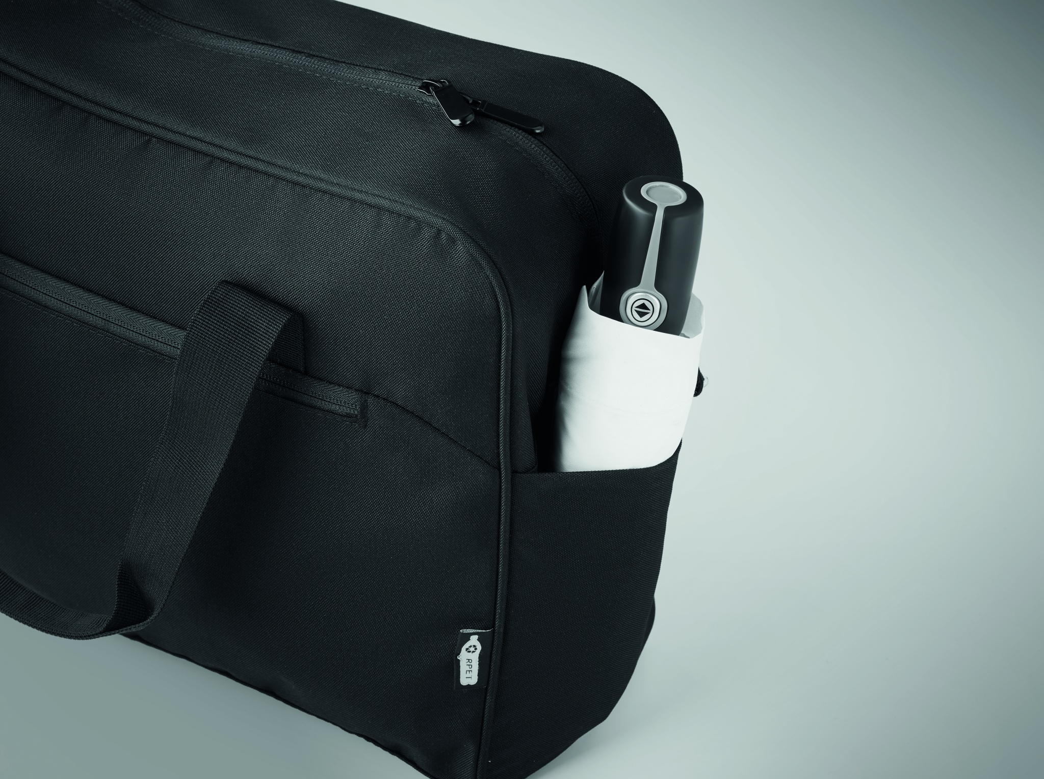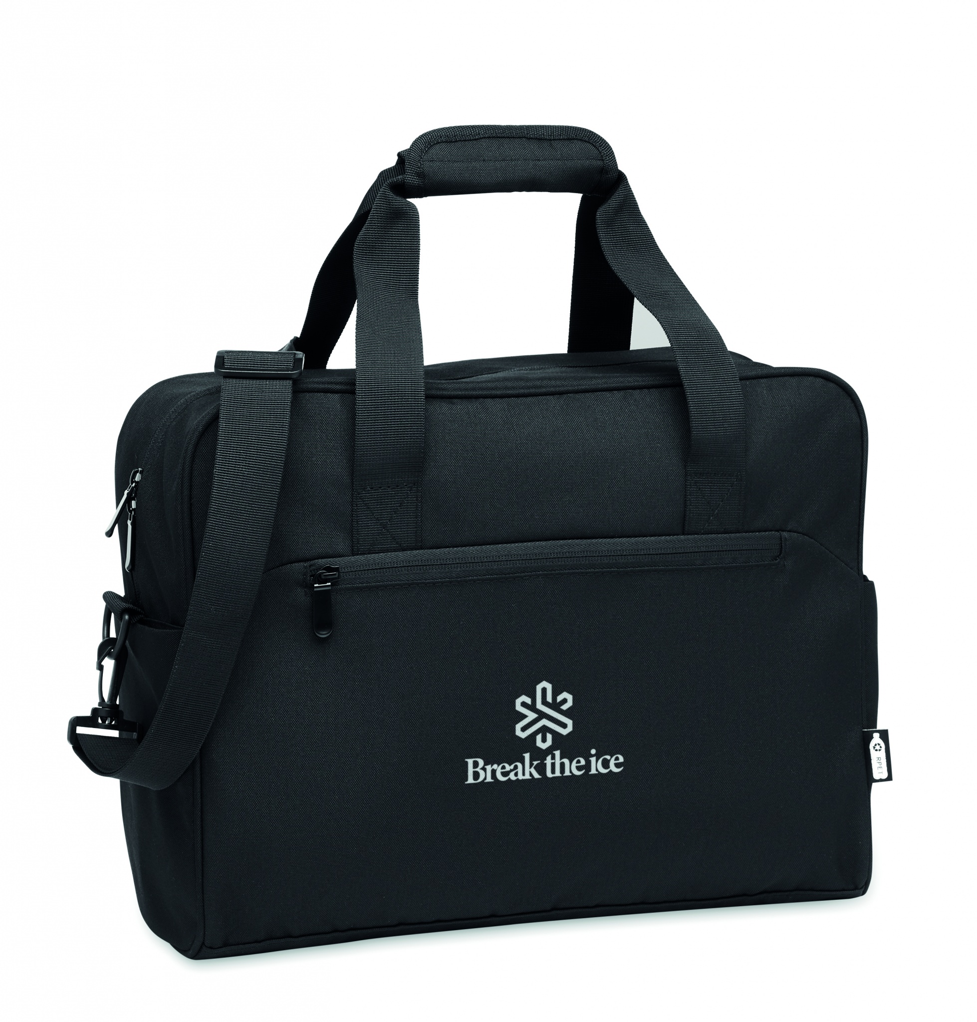 Carry-on hand luggage travel bag in 600D RPET with large zippered front pocket, two small side pockets. Includes 15 inch laptop compartment. Padded removable and adjustable shoulder strap. Trolley holder on reverse side.