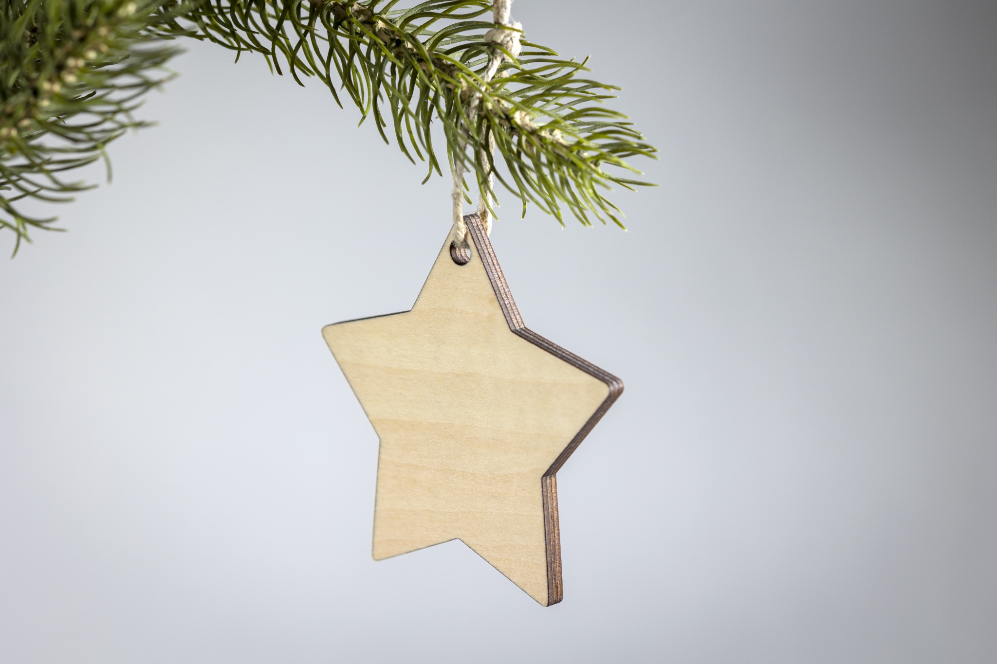 Christmas ornament in plywood with jute rope for sublimation in star shape. White imprint is not possible.