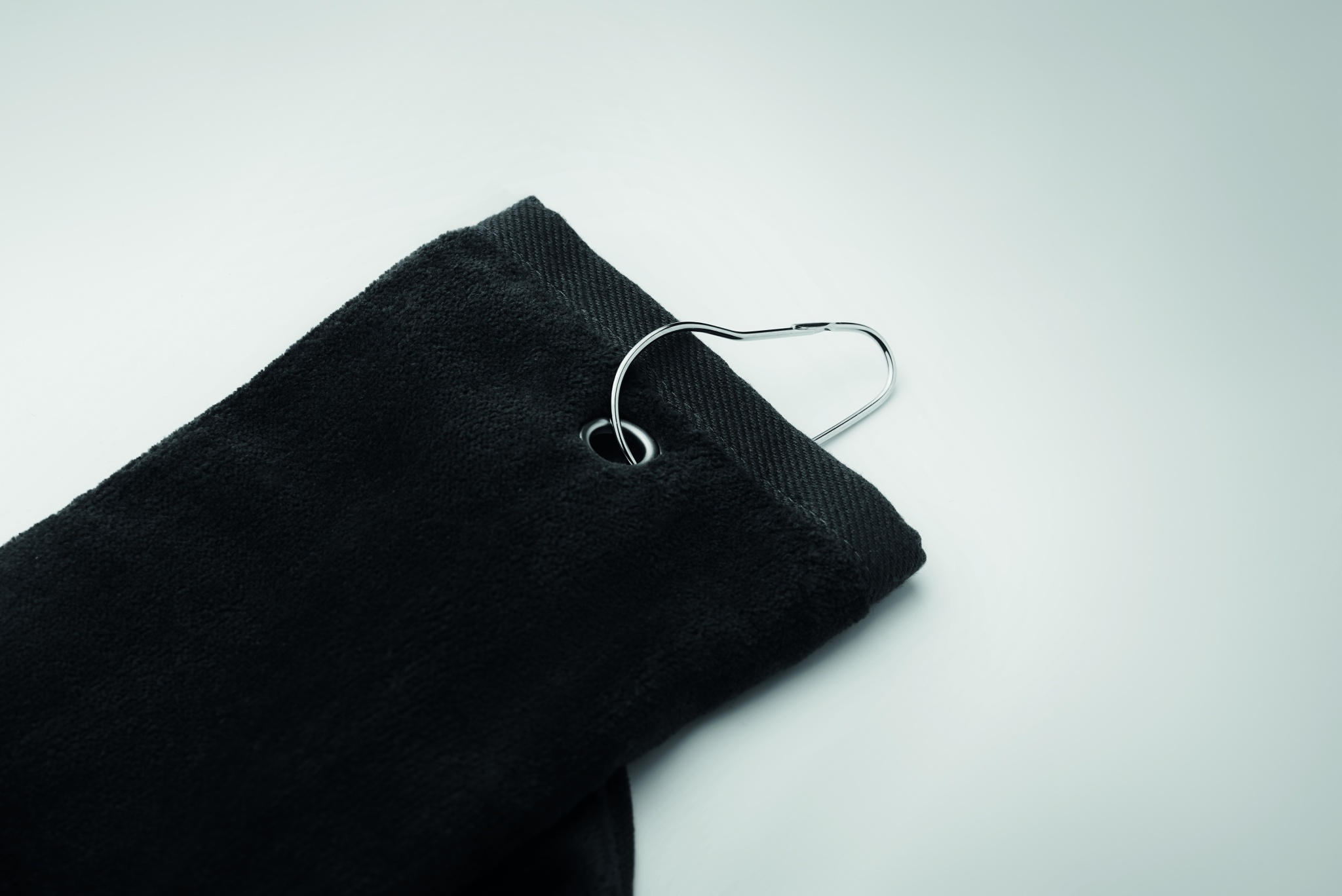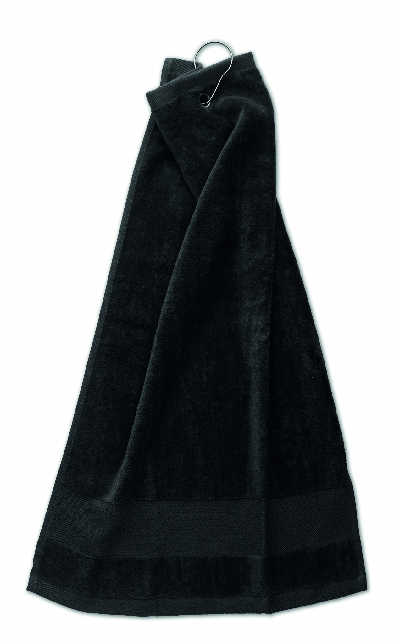 Cotton golf towel with a copper hole and ring on top that can be used as a hanger. 350 gr/m². Towel size: 40x60 cm.