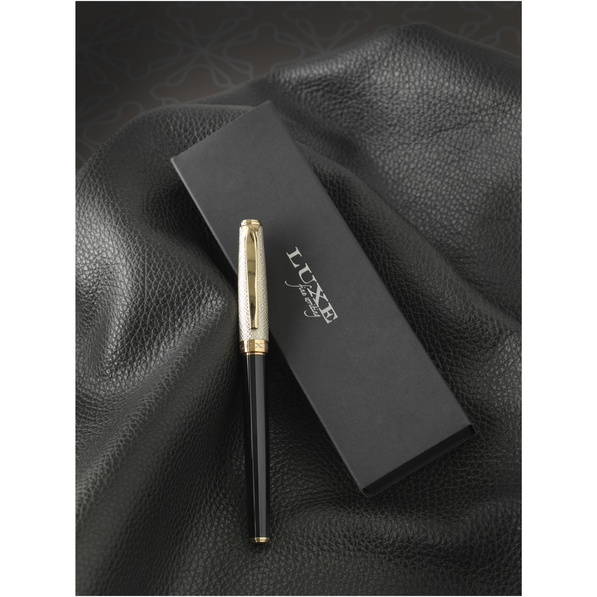 A luxurious rollerball pen, with gold leather cap and lacquered golden parts, delivered in a Luxe gift box. Lower barrel is made out of brass with lacquer and upper barrel out of brass and PU. Rollerbal pen: 14 cm x 1.15 cm, weight: 32 gr, writing length: 500 m.