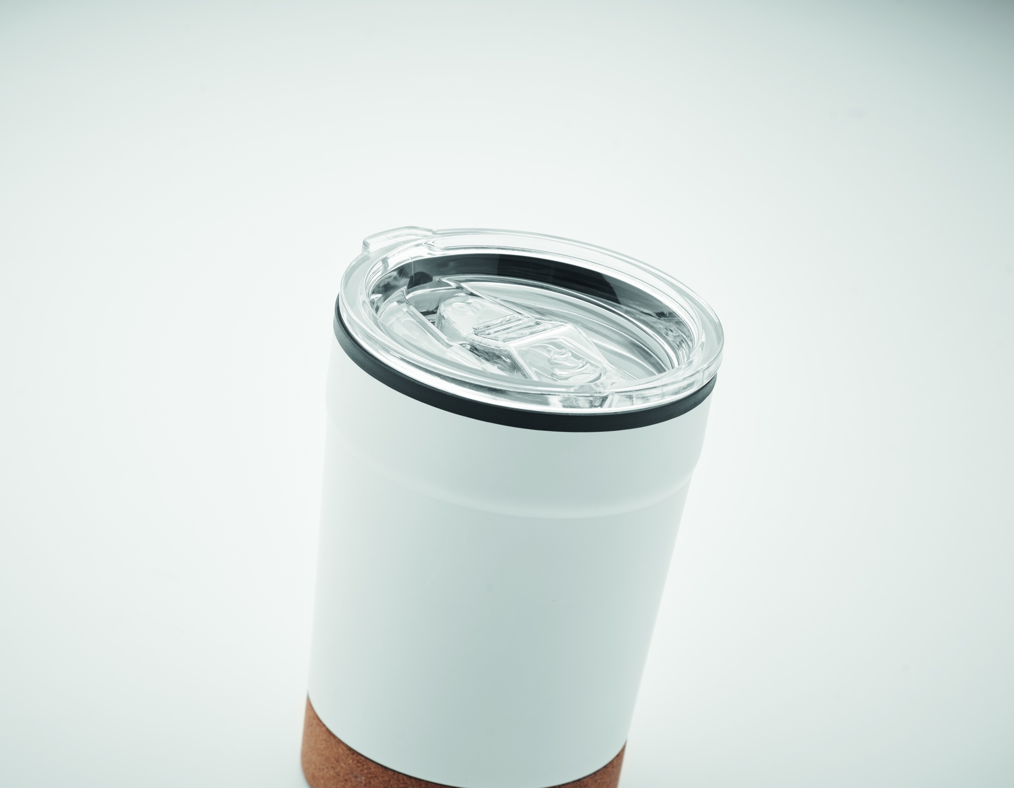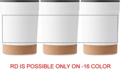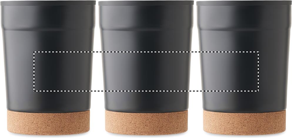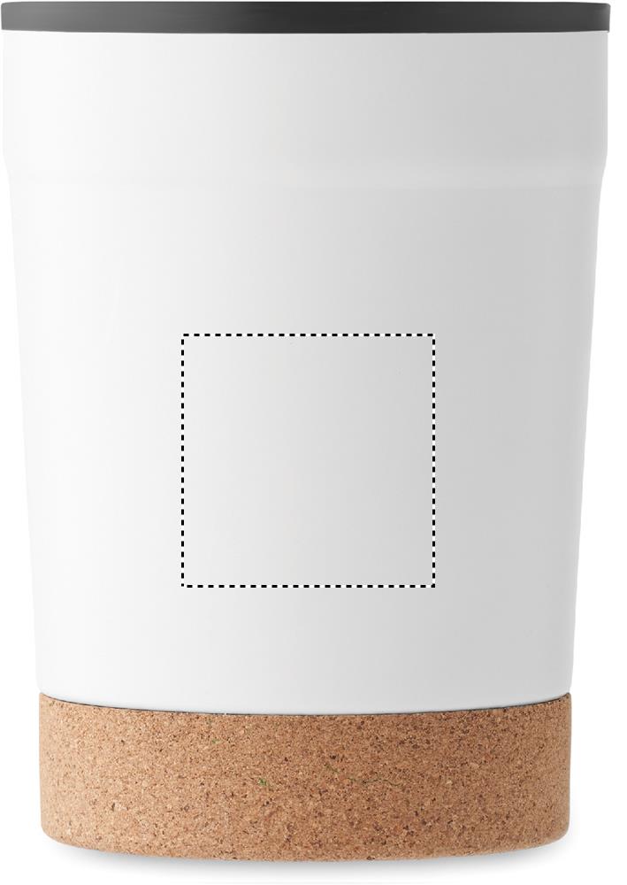 Double wall tumbler with stainless steel outer and PP liner inside, with cork base and with sliding sip hole. Leak-free. Capacity: 300 ml.