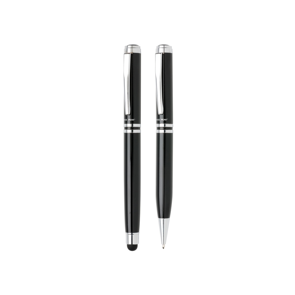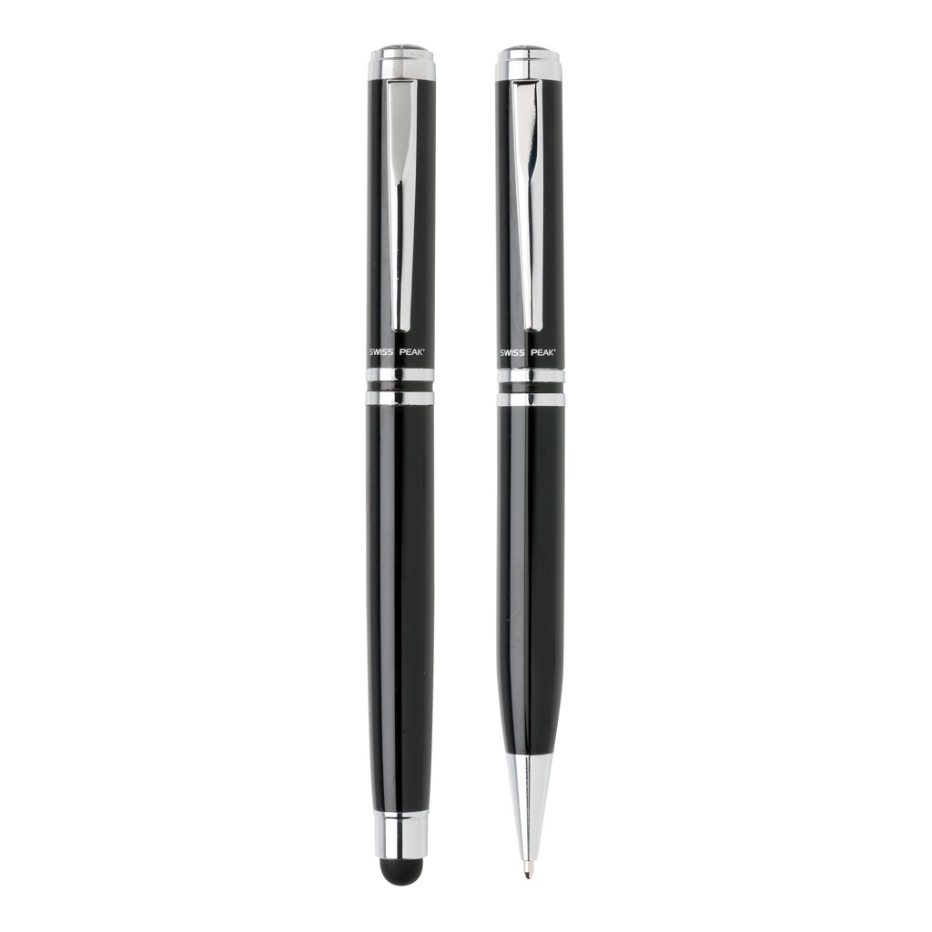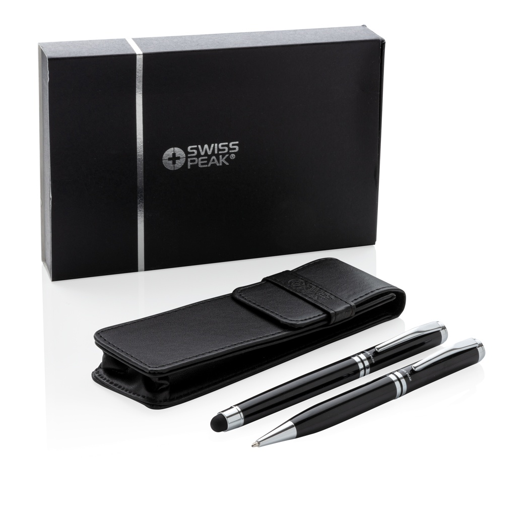 Authentic pen set bearing all the hallmarks of classic quality. High quality heavy brass metal rollerball with stylus and ball point pen with Swiss Peak branding. Including premium PU leather pouch and giftbox. Blue ink.