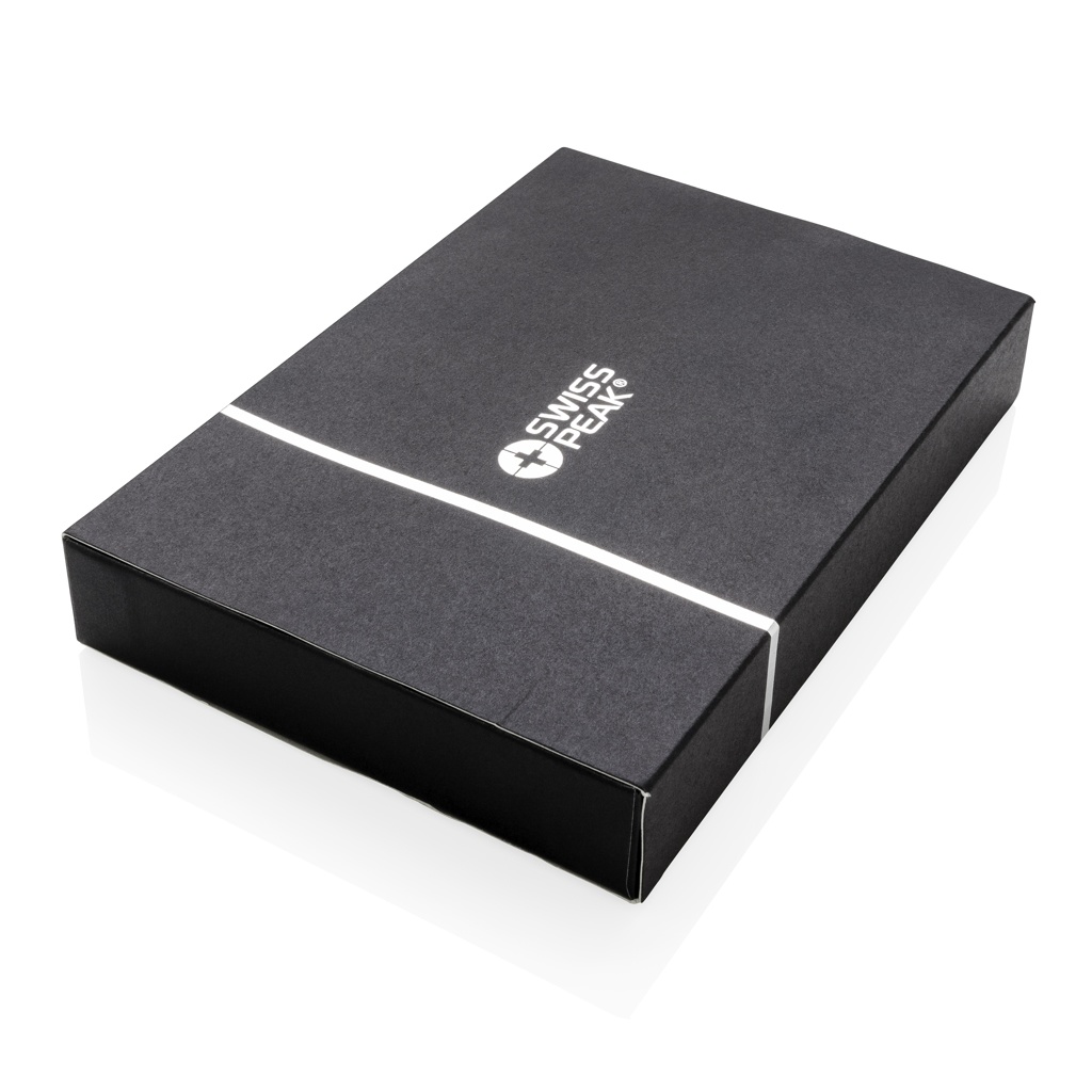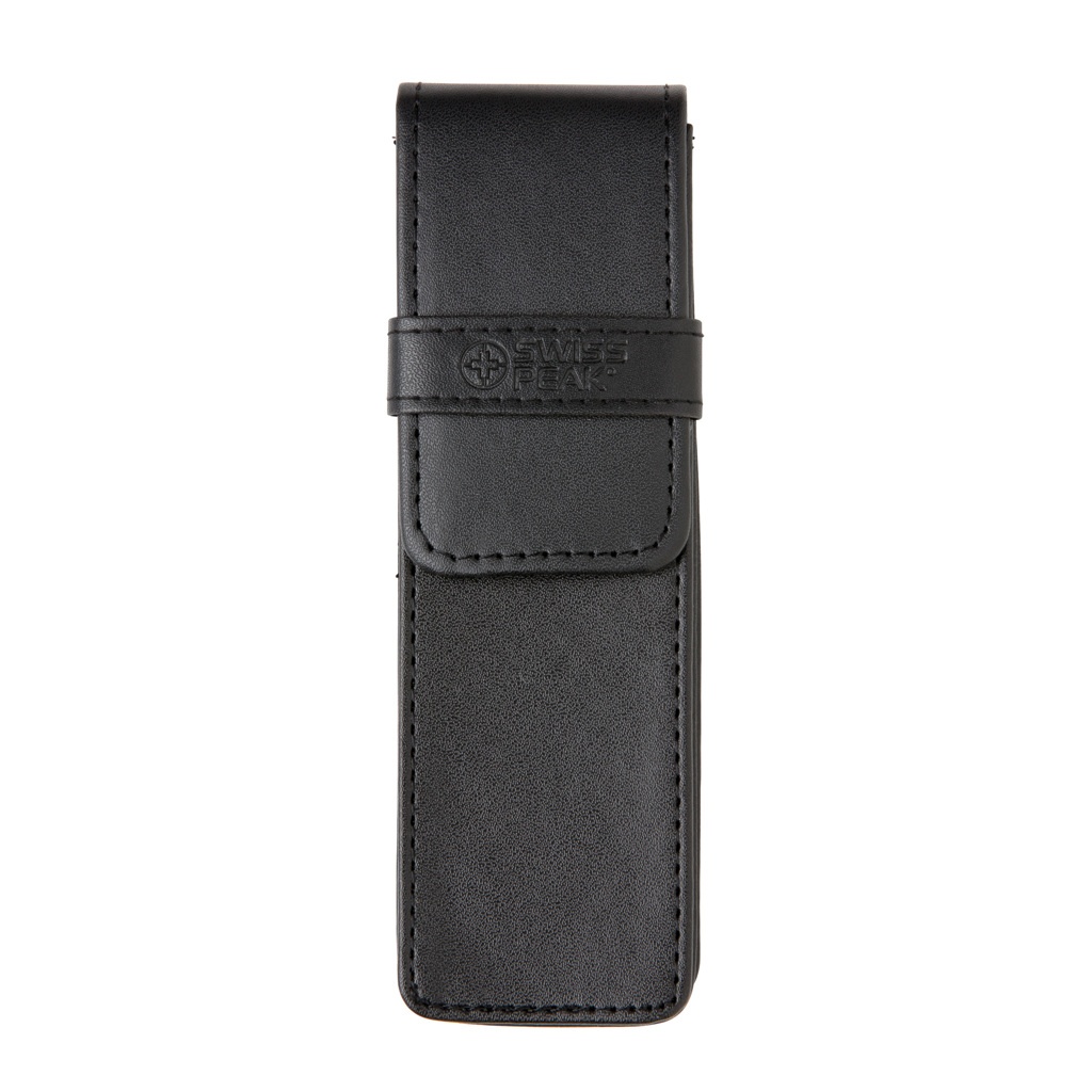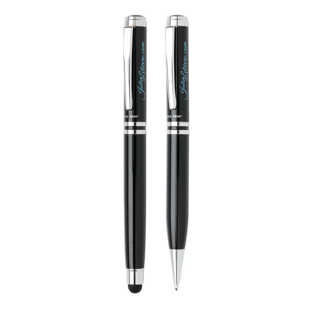 Authentic pen set bearing all the hallmarks of classic quality. High quality heavy brass metal rollerball with stylus and ball point pen with Swiss Peak branding. Including premium PU leather pouch and giftbox. Blue ink.