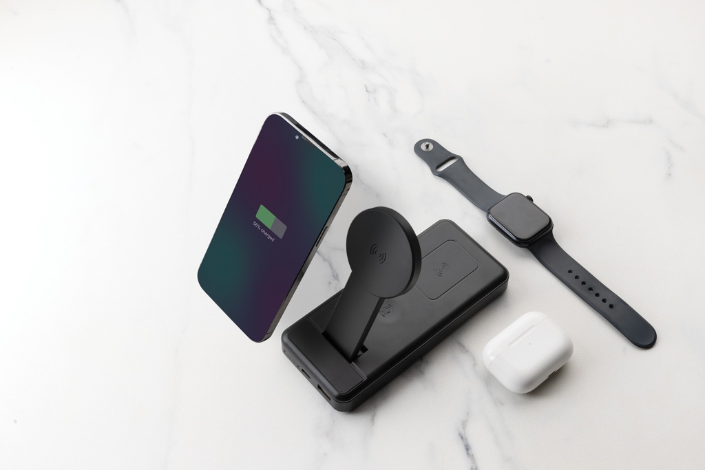 Unique 3 in 1 design 10.000 mAh 15W powerbank with a case made out of RCS certified recycled ABS plastic. RCS (Recycled Claim Standard) is a standard to verify the recycled content of a product throughout the whole supply chain. Total recycled content: 22 % based on total item weight.The powerbank contains a long lasting grade A 10.000 mAh lithium polymer battery. The powerbank has a foldable integrated 15W magnetic wireless charging stand and 5W secondary wireless charger that can be used for smaller wireless items like earbud cases and a third 2.5W watch charger for IOS watches. The power indicators will indicate the remaining energy level so you always know when to re-charge.; item and accessories PVC free. Including RCS certified recycled TPE charging cable. Packed in FSC® mix packaging. Type-C input 5V2.5A 9V2A 12V1.5A; Type-C output:5V3A 9V2.22A 12V1.67A; USB-A output:5V3A 9V2A 12V1.5A 5V4.5A
