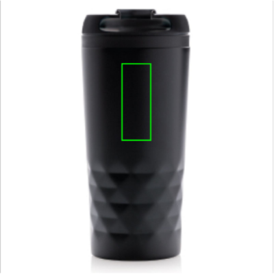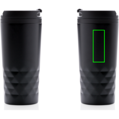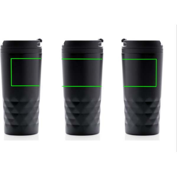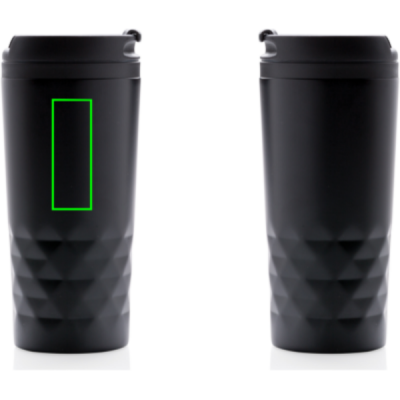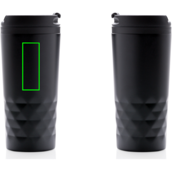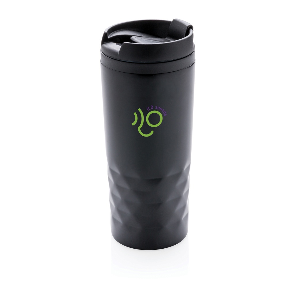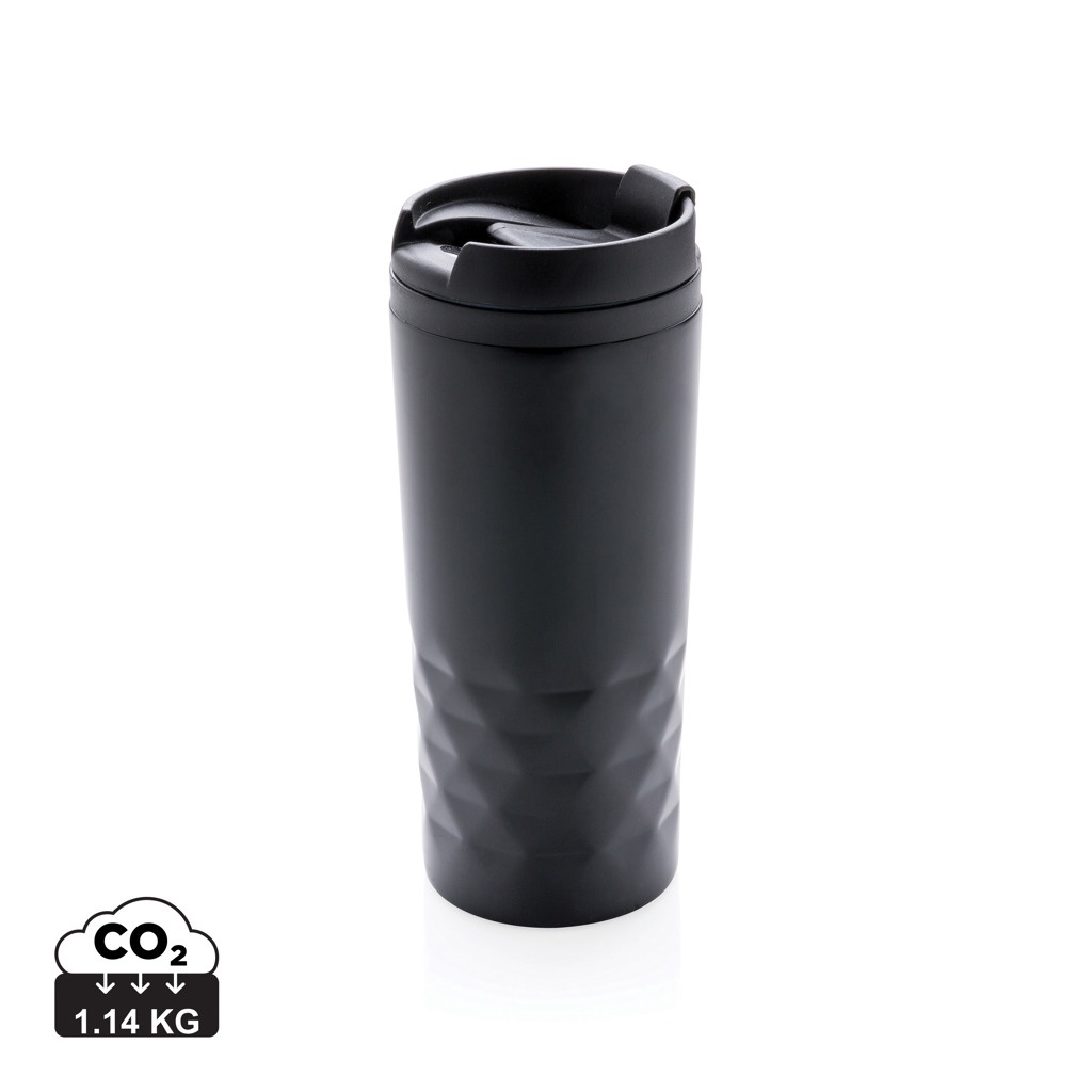 Fashionable stainless steel tumbler with geometric details. Inner body is made out of plastic. Handwash only. Content 300ml.