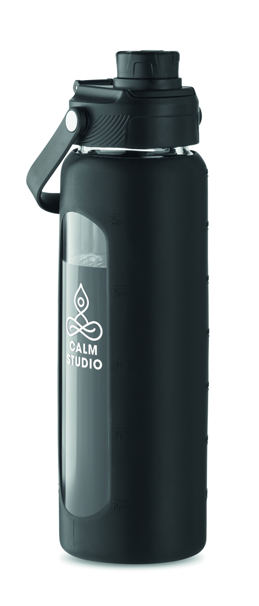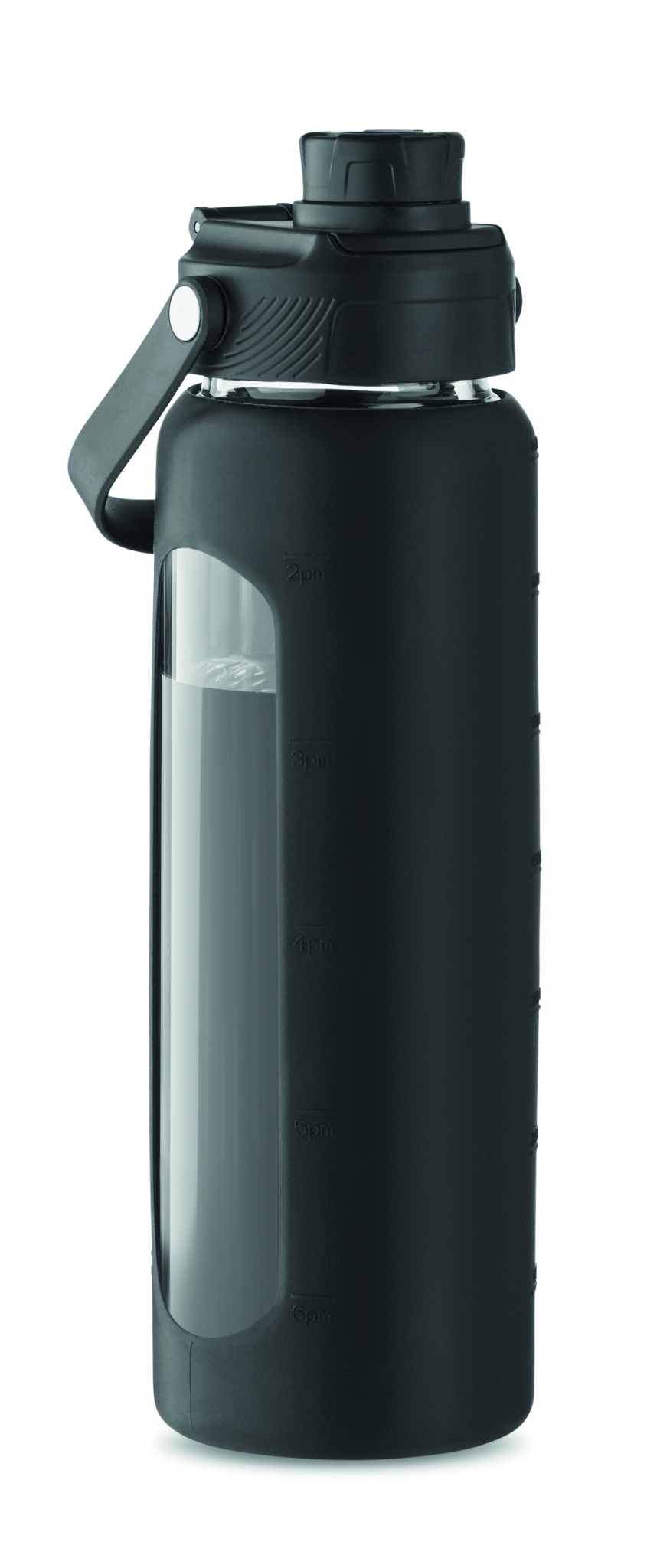 High borosilicate glass bottle with silicone see-through sleeve with PP lid with carry handle. Leak-free. Capacity: 750 ml.