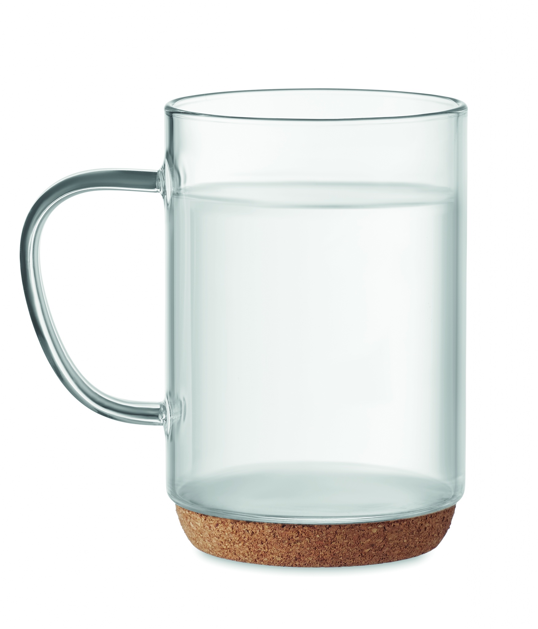 Borosilicate glass mug with cork base. Capacity: 400 ml. Cork is 100% natural material. Due to its structural nature and surface porosity the final print result per item may have deviations.
