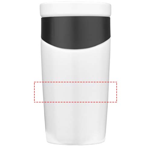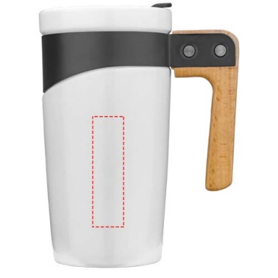A must-have ceramic tumbler. Matte finish body and natural wooden handle are combined by the black coated stainless steel band. Push-on, slide lock lid included. Volume capacity is 475ml. Presented in a gift box.