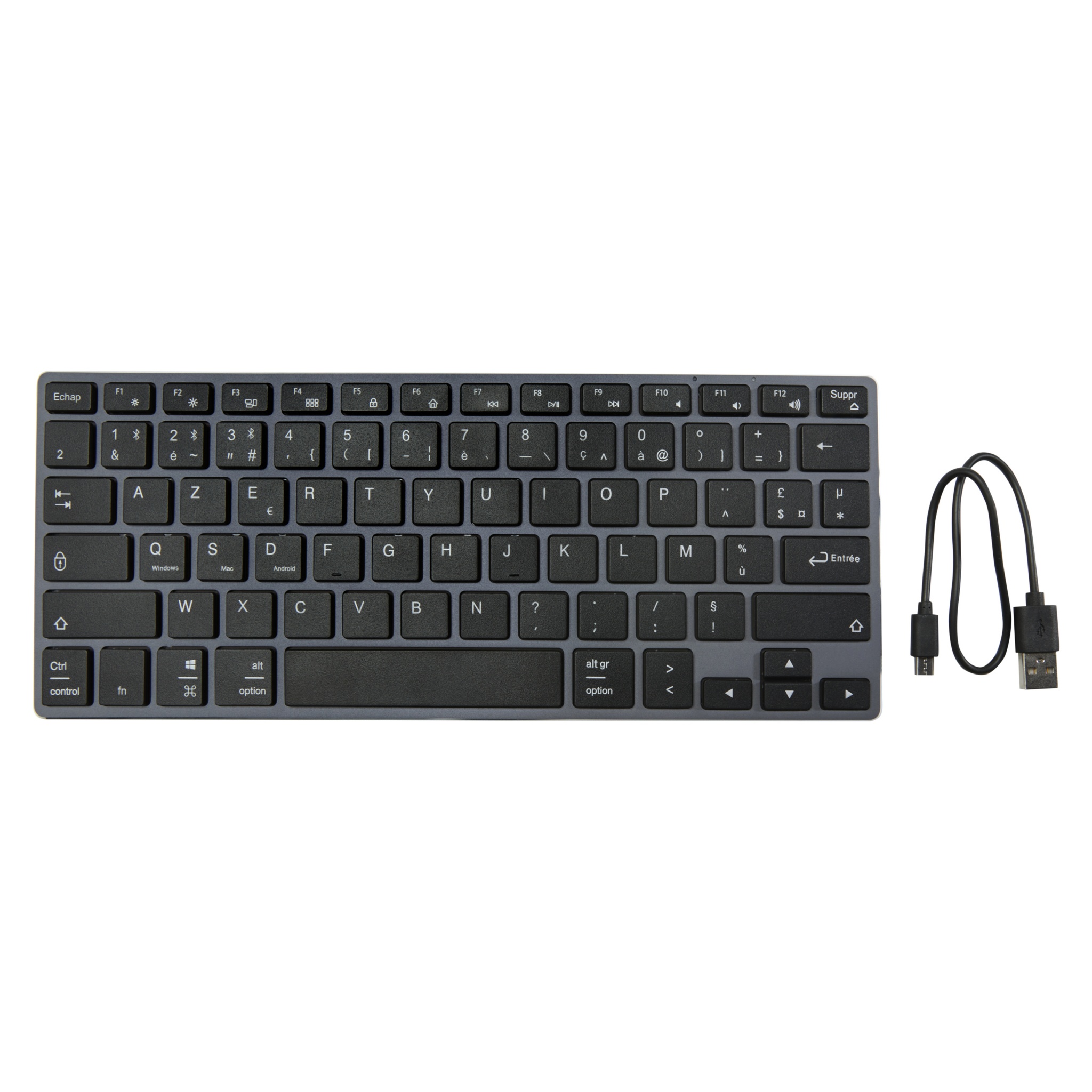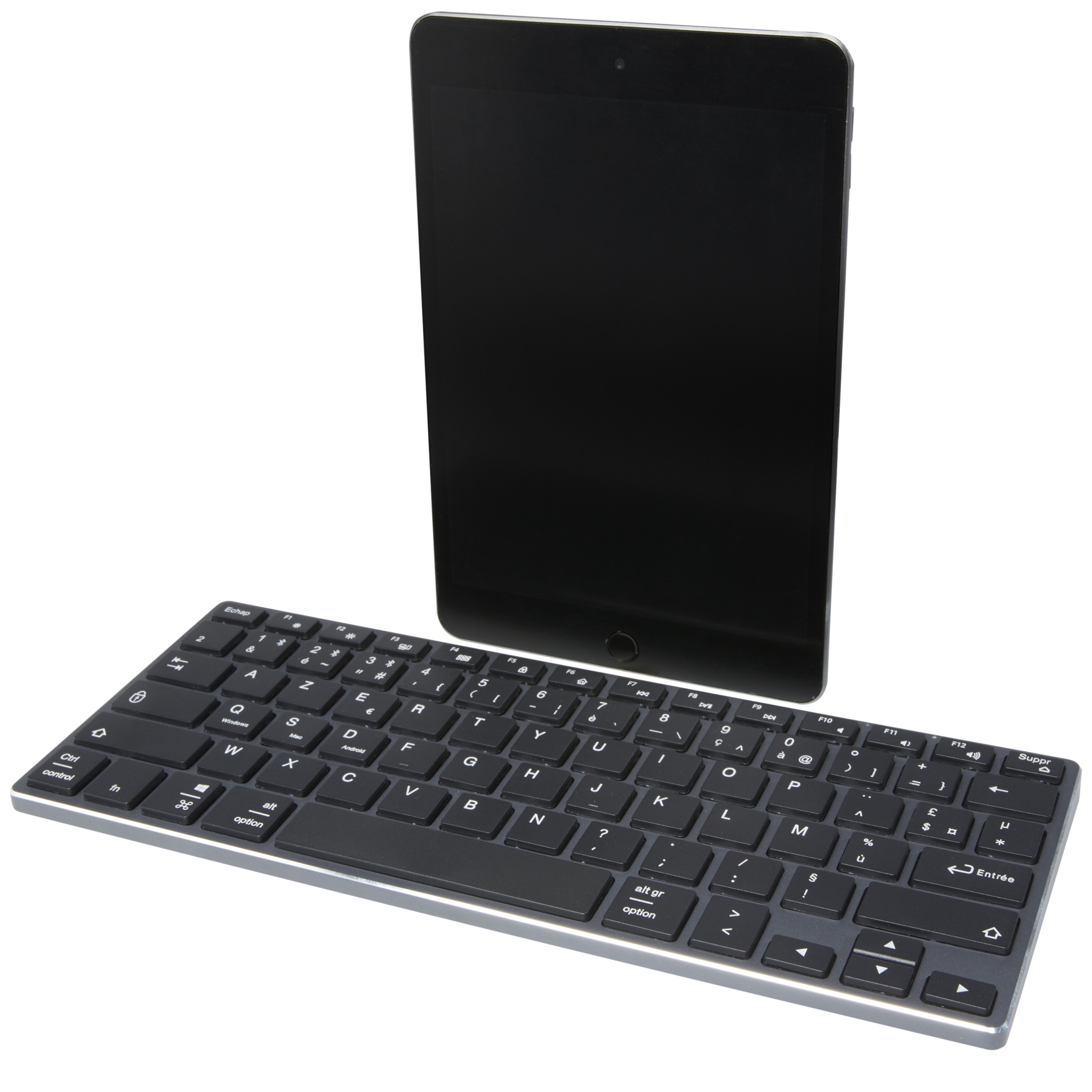 Lightweight yet durable and stylish keyboard (AZERTY layout with 78 keys) with aluminium housing. The keyboard supports Bluetooth® 4.0 for a stable connection and low power consumption, and is compatible with PC/laptop, tablets, mobile phones, smart TVs and other devices with Bluetooth® function. The operating distance is up to 10 meters, and the keyboard has a 350mAh built-in and rechargable battery. Delivered in a premium kraft box with a colourful sticker.