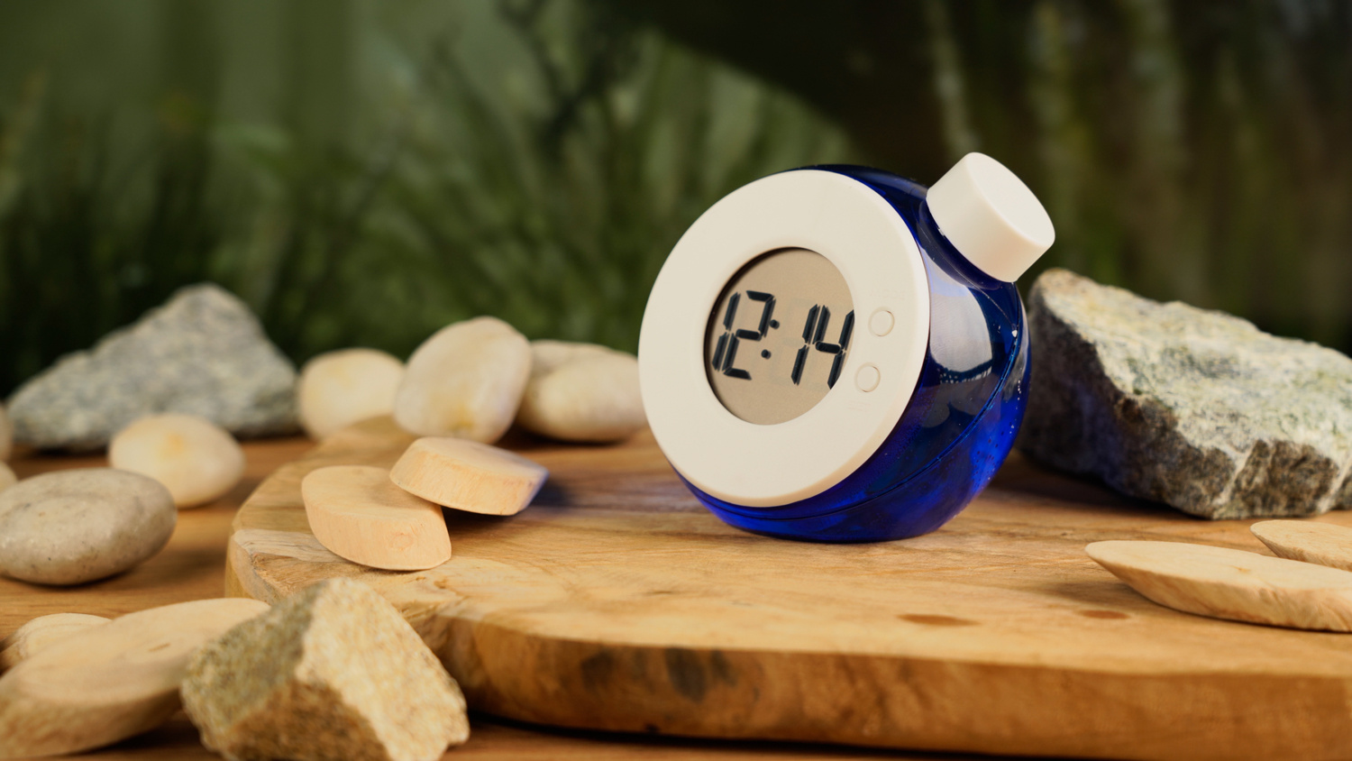 This water clock doesn't require battery at all. As long as the bottle on the back of the clock is filled with water, the time and date can be clearly displayed. One filling can last for several weeks. The source of electricity produces water that initiates internal chemical reactions. 2-3g of salt needs to be added to water used for filling the clock.