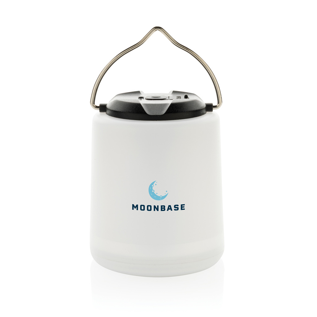 The Limio RCS Recycled plastic portable Rechargeable table lamp is a versatile lighting solution for both indoor and outdoor use. Designed to stand on a table or hang as needed, it features a rechargeable battery powered via USB-C, delivering up to 4 hours of illumination and fully recharging in just 2 hours. The LED light provides up to 300 lumens and offers three modes: strong, dimmed, and flashing, catering to various lighting needs. With an IPX4 waterproof rating, it is suitable for use in wet conditions. The case is made from RCS certified recycled ABS plastic. RCS (Recycled Claim Standard) is a standard to verify the recycled content of a product throughout the whole supply chain. Total recycled content: 25 % based on total item weight. This lamp is PVC-free and packaged in an FSC-certified kraft box.