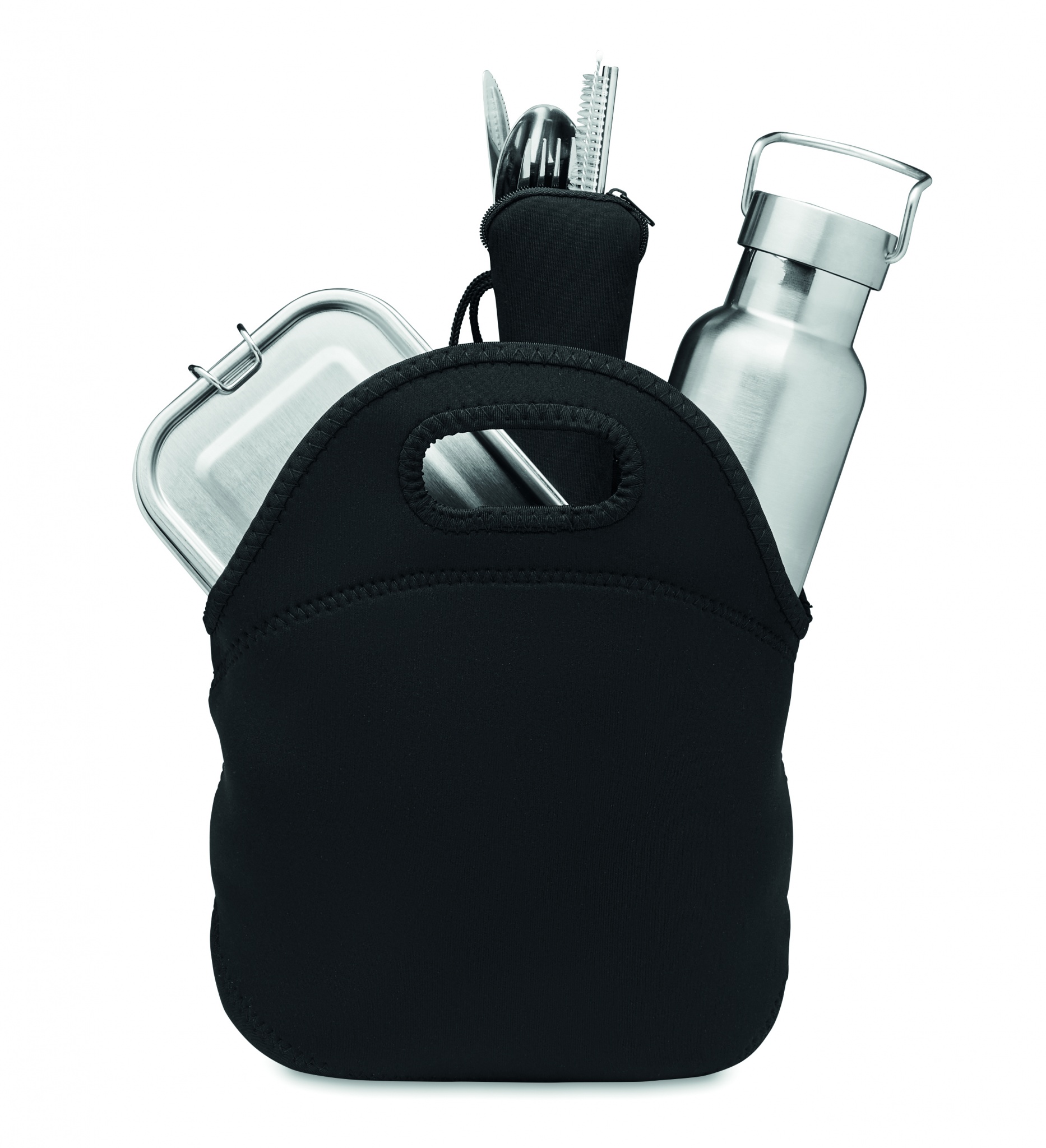 Lunch set presented in neoprene bag. Including Double wall stainless steel vacuum bottle (500 ml) , lunch box (600 ml) and cutlery in zippered neoprene pouch.