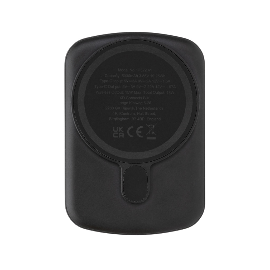 5000 mAh pocket size powerbank with 15W magnetic wireless charger with a case made out of RCS certified recycled ABS plastic. RCS (Recycled Claim Standard) is a standard to verify the recycled content of a product throughout the whole supply chain. Total recycled content: 21 % based on total item weight.The powerbank contains a long lasting grade A 5.000 mAh lithium polymer battery. The integrated digital LED screen will indicate the remaining energy level so you always know when to re-charge.; Type-C Input 5V/2.4A; Type C output:5V/2A.4A Item and accessories PVC free. Including RCS certified recycled TPE charging cable. Packed in FSC® mix packaging. Type-C Input: 5V/3A 9V/2A 12V/1.5A; Output: USB-C output: 5V/2.4A,9V/2.22A,12V/1.67A; Wireless output: 15W