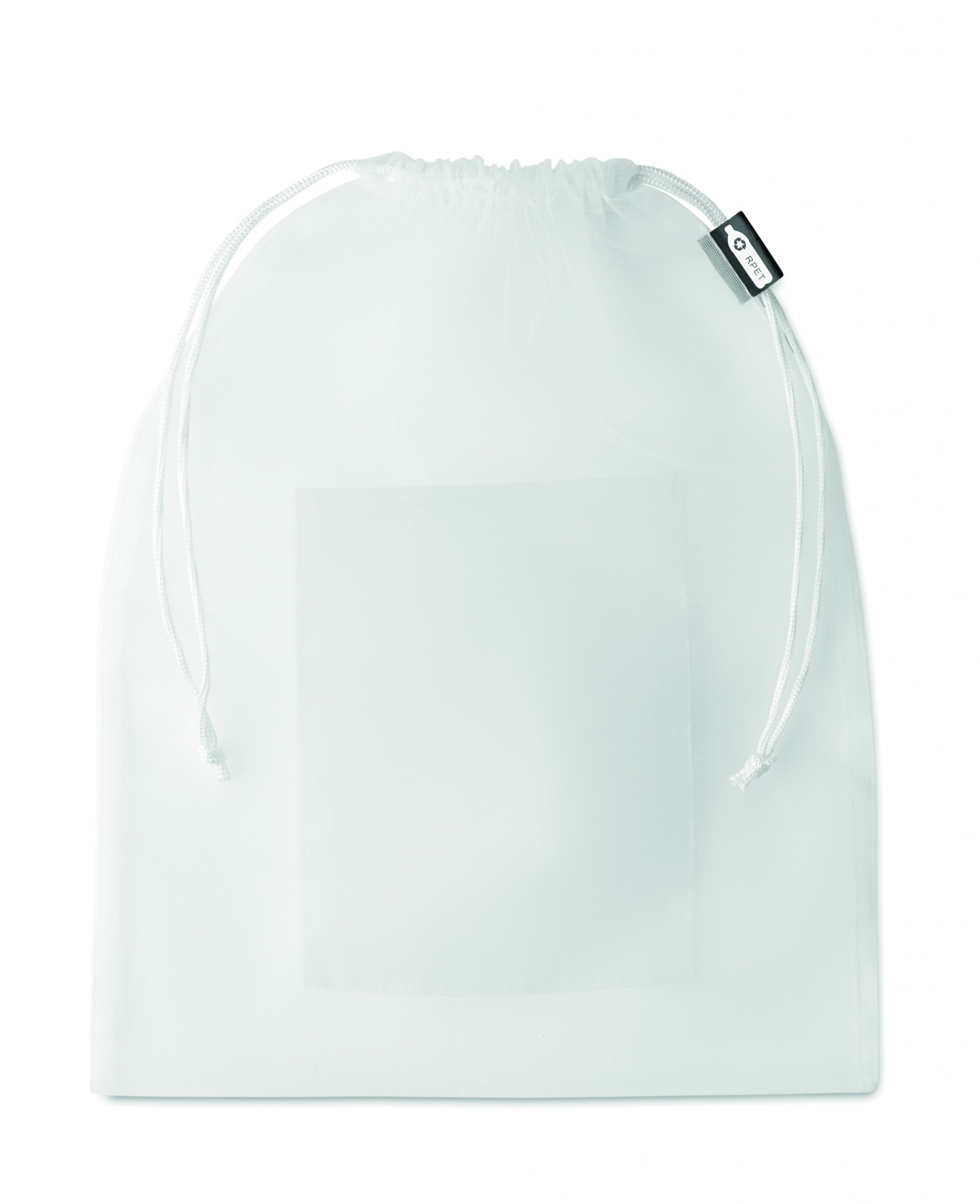 Food bag in mesh RPET with front pocket and white PP drawstring cord on top.