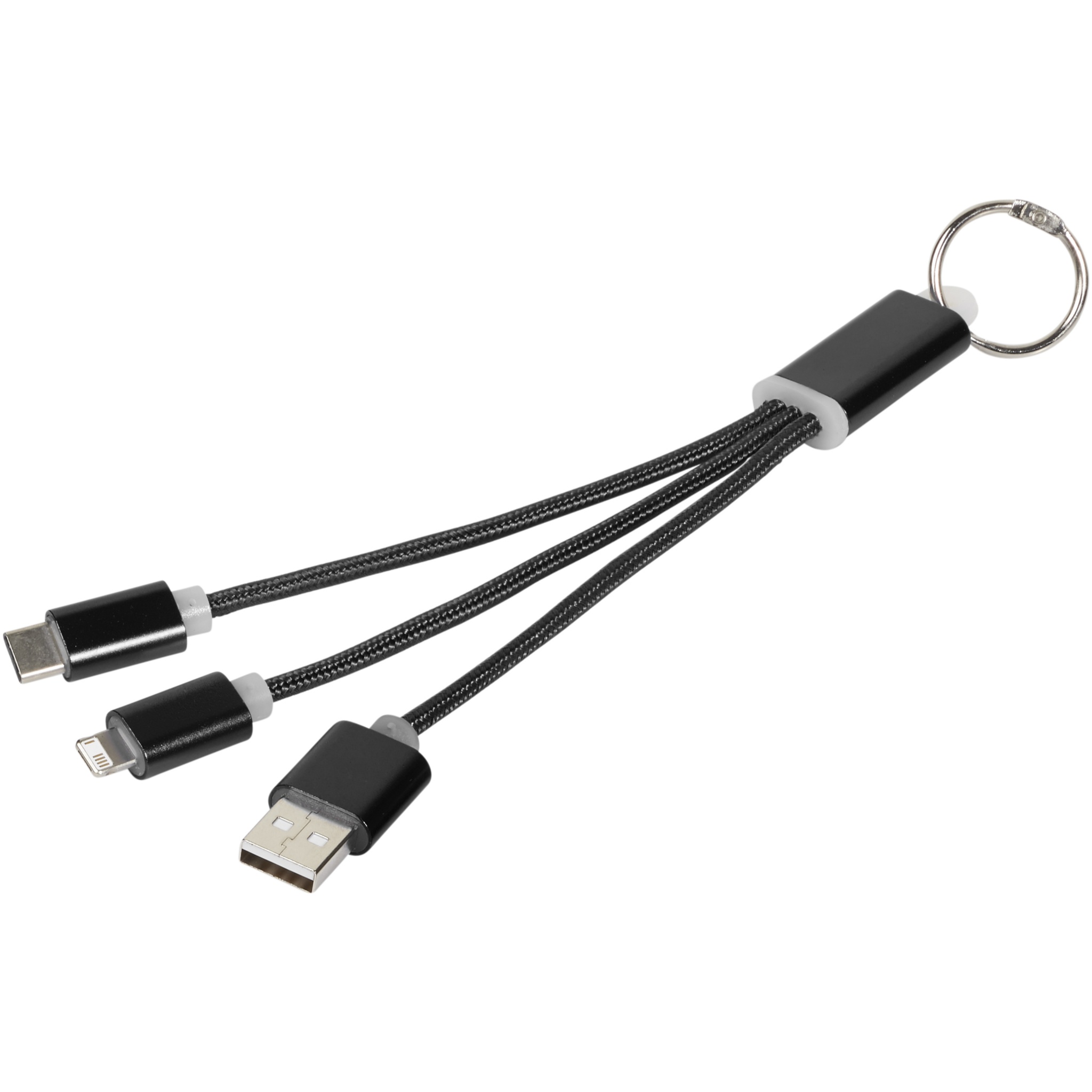 Metal 3-in-1 Charging Cable with Key-ring. The Metal 3-in-1 Charging Cable with Key-ring features a 1 type C, 1 USB type A and a 2-in-1 dual compatible tip for both Apple iOS and Android devices. Comes with a key chain. To charge Apple devices put the cable with the side that has no pins in the device and to charge Android devices put the cable with the side that has pins in the device. .