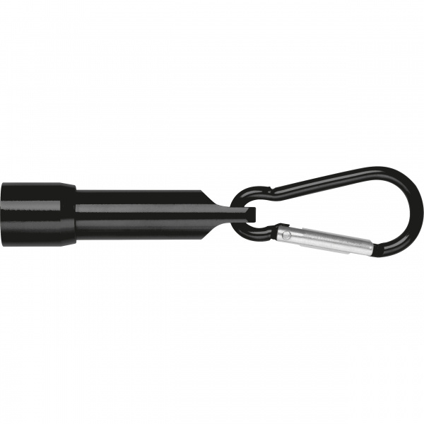 Mini flashlight with carabiner hook made from recycled aluminum. Includes 4 button cell batteries. Your logo is applied to the flashlight using laser engraving.
