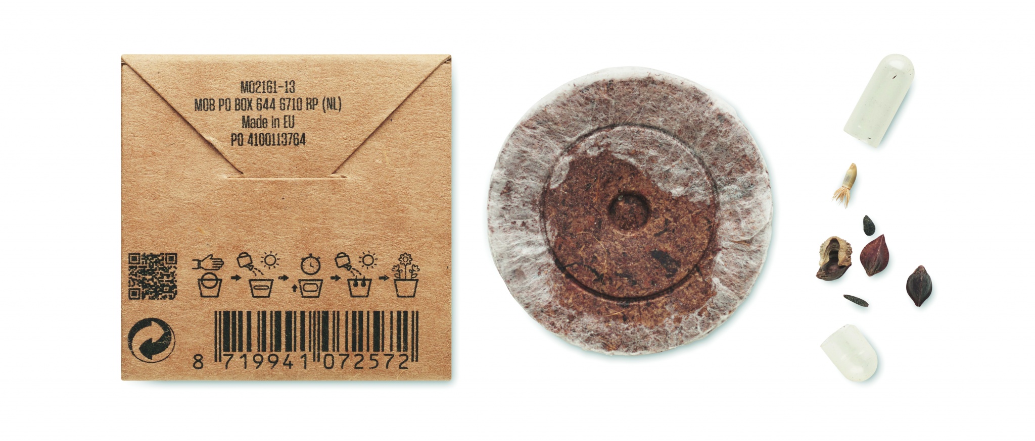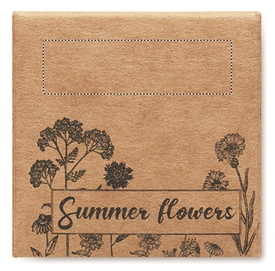 Pressed peat disc with mixed summer flower seeds presented in carton box. Made in EU.