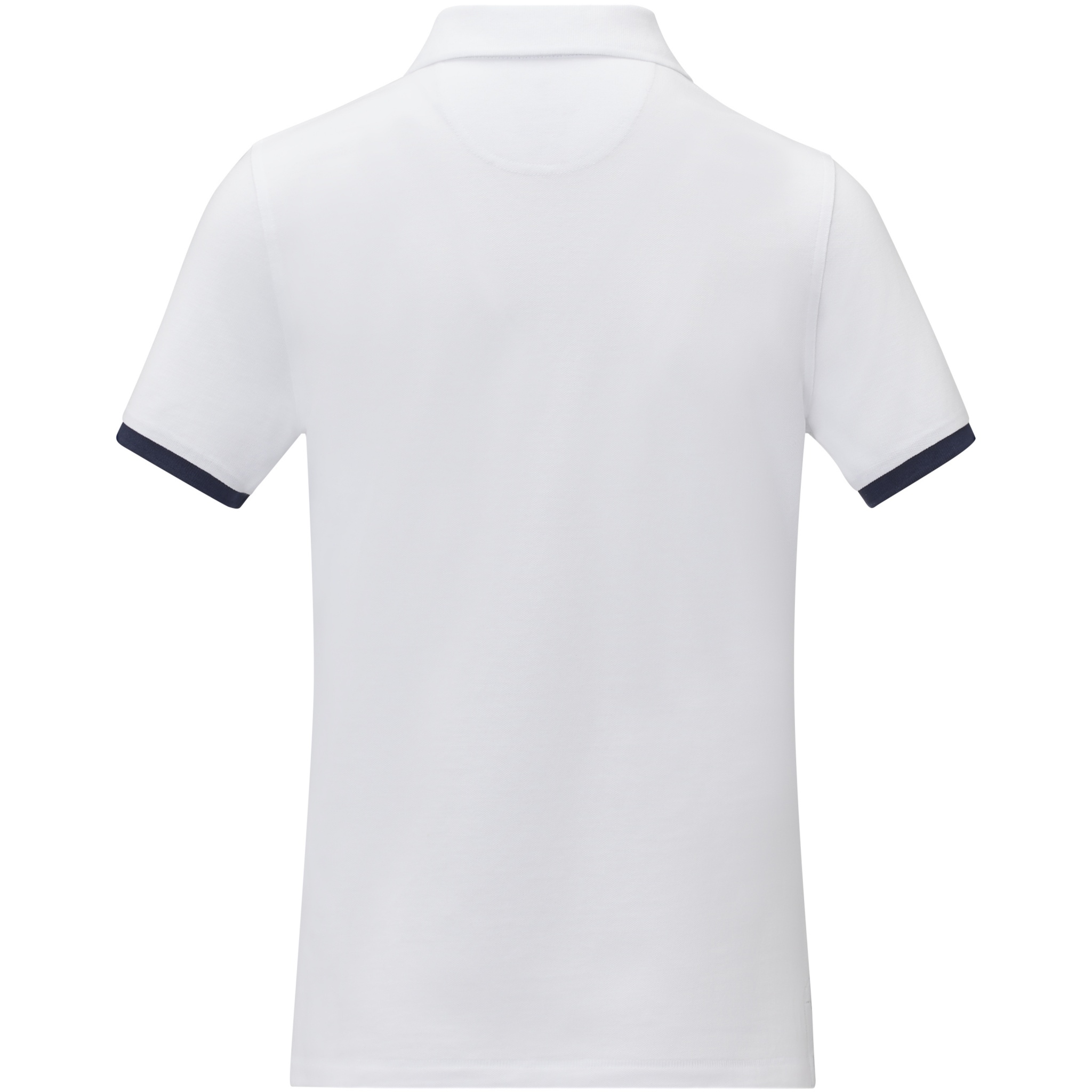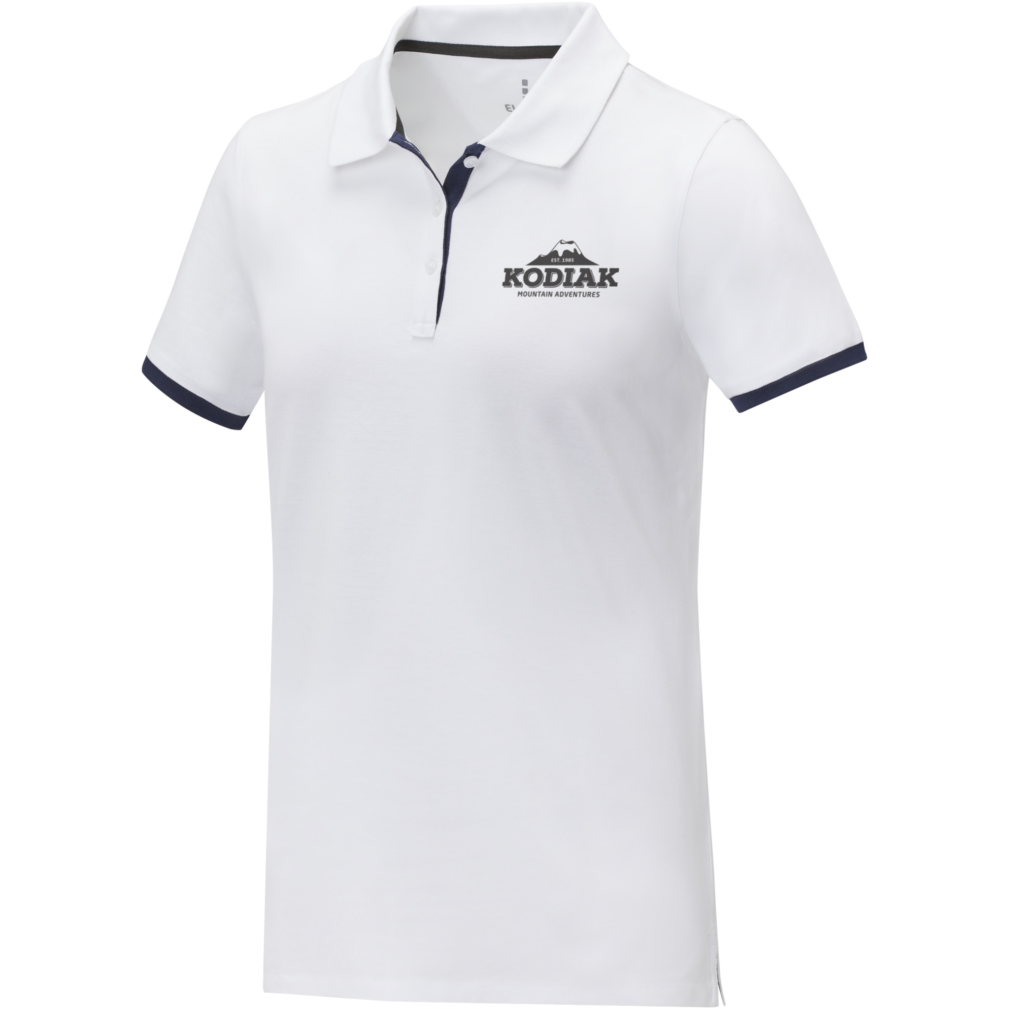 The Morgan short sleeve women's duotone polo is a stylish and comfortable option for any casual or business setting. Made from a 200 g/m² piqué knit cotton fabric, this polo is both durable and breathable. Featuring a flat knit collar and rib cuffs with contrast colour detailing, this polo offers a modern twist on a classic design. The two-button placket and pick-stitch details add an extra touch of sophistication, and the satin neck tape and heat transfer main label provide comfort and ease of wear. This polo is designed with a fitted shape for a feminine look.