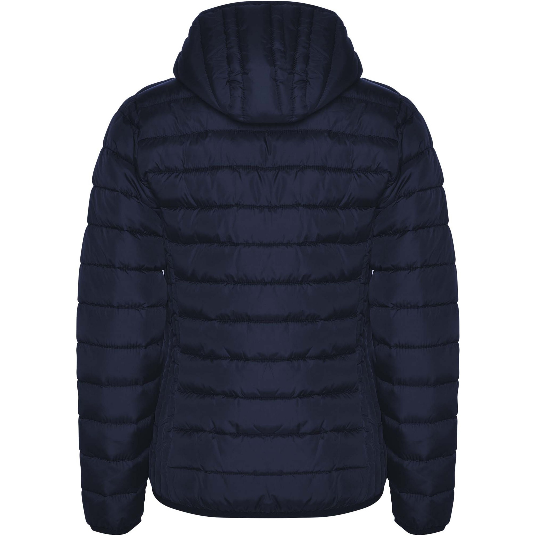 Women's feather touch quilted jacket with fitted hood. Inverted zips with matching chin protector. Two front pockets with zip. Matching elastic trim in cuffs, hem and hood. Contrasting inner lining. Stow carry bag included. Light and foldable garment. Fitted-cut. Water resistant. Wind-proof model.