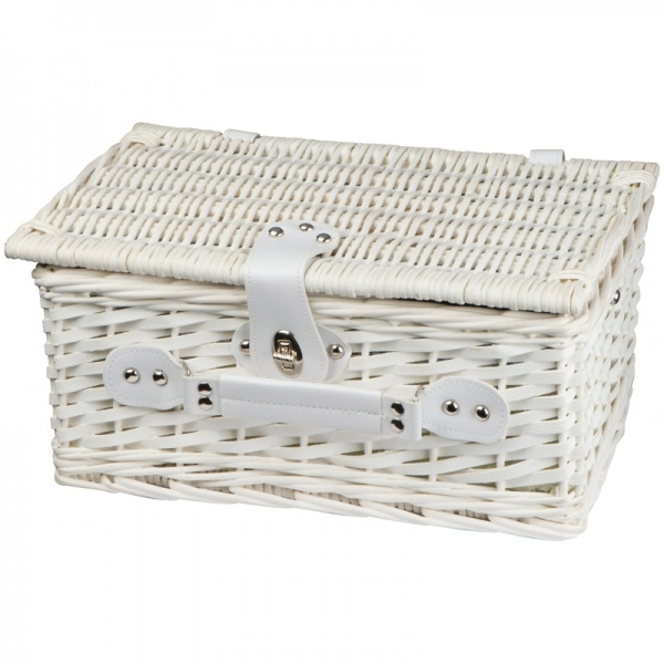 Mini wicker picnic basket for two. With ceramic plates and cups, stainless steel cutlery, salt and pepper shaker. Your logo will be engraved or digitally printed on an aluminium label attached to the basket.