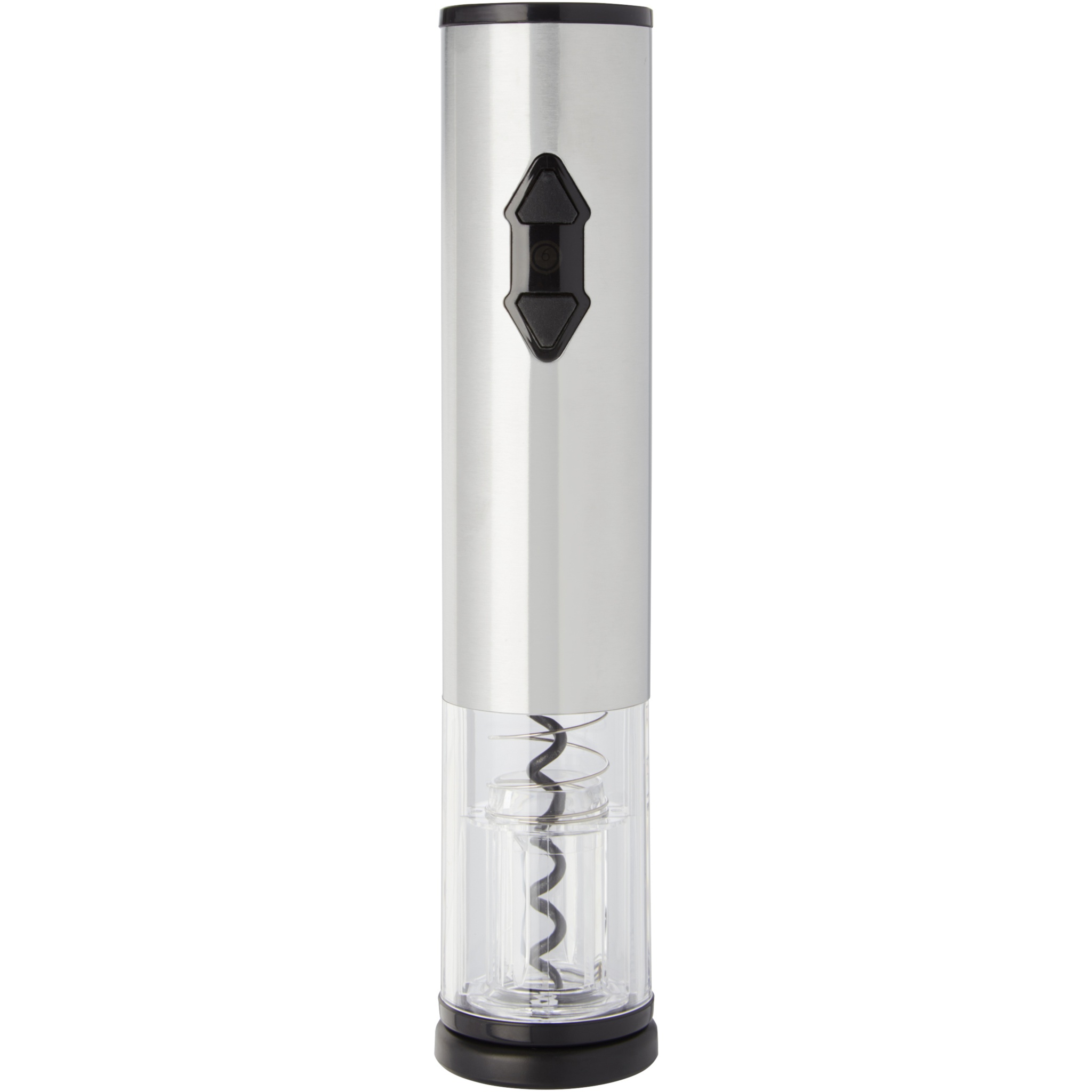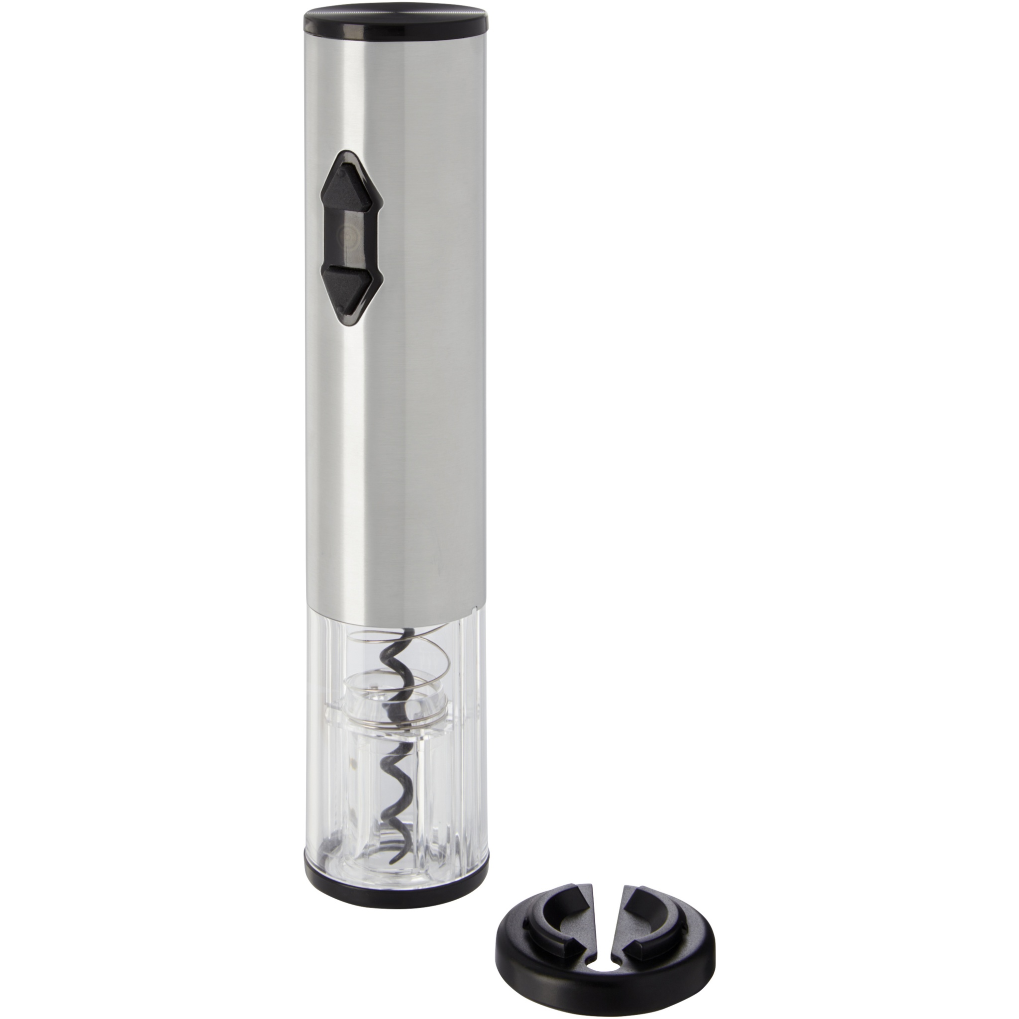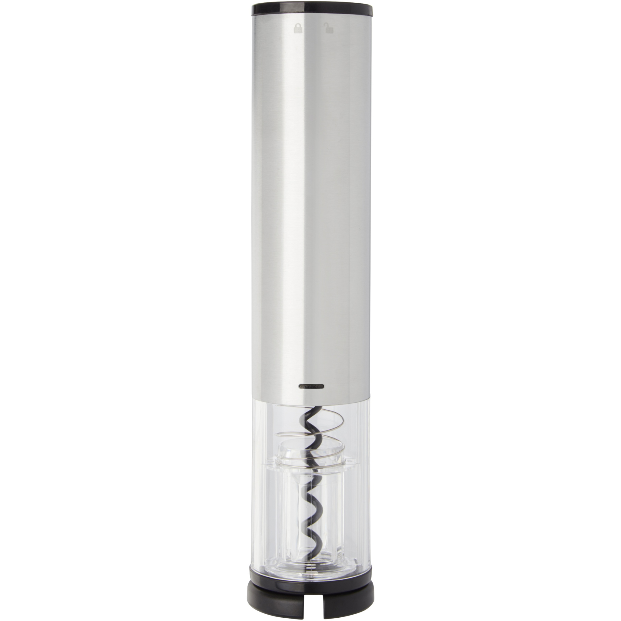 Electric wine opener in combination with a foil cutter, a pourer and a stopper. It works with 4 AA batteries (not included).