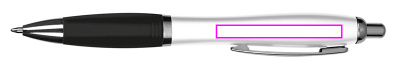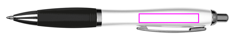 Ballpoint pen with white barrel, metal clip, blue writing large capacity refill and colored soft touch grip zone. We print your logo on the right side of the clip.