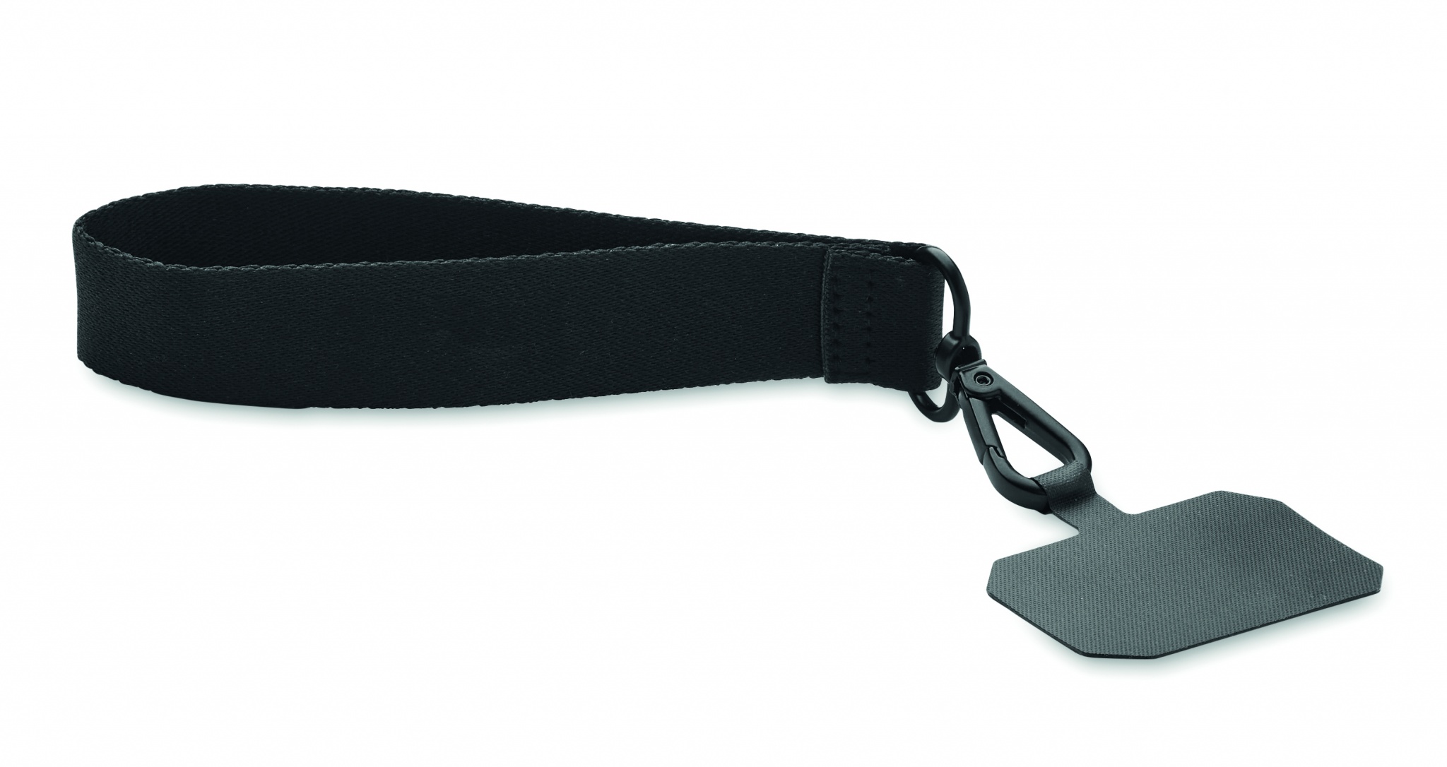 Phone cord holder wrist strap in polyester with safety buckle. 2.5 cm.